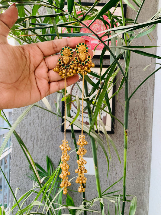 Kashmiri Emerald Green Golden Long Ghungroo Earrings