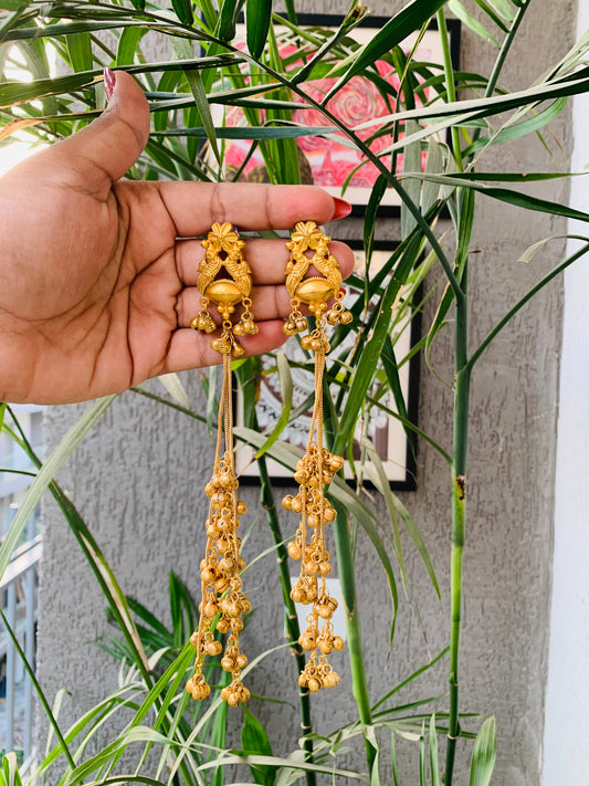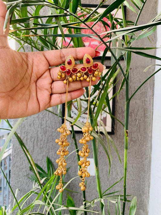 Kashmiri Ruby Leaves Golden Long Ghungroo Earrings