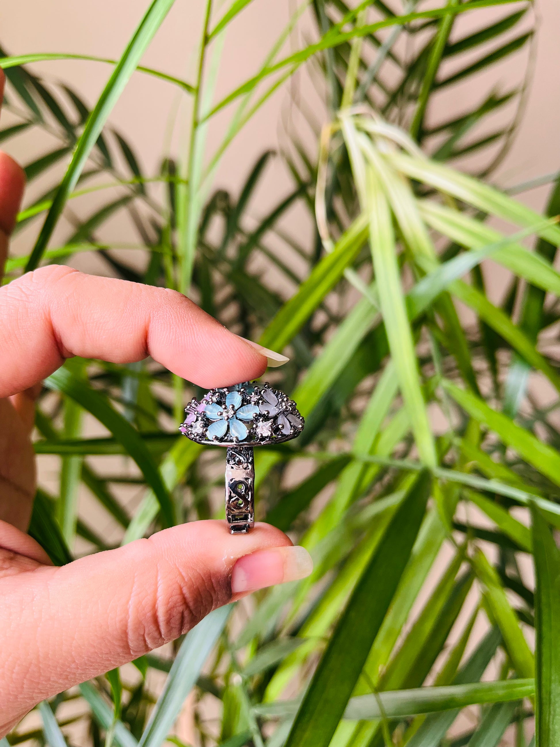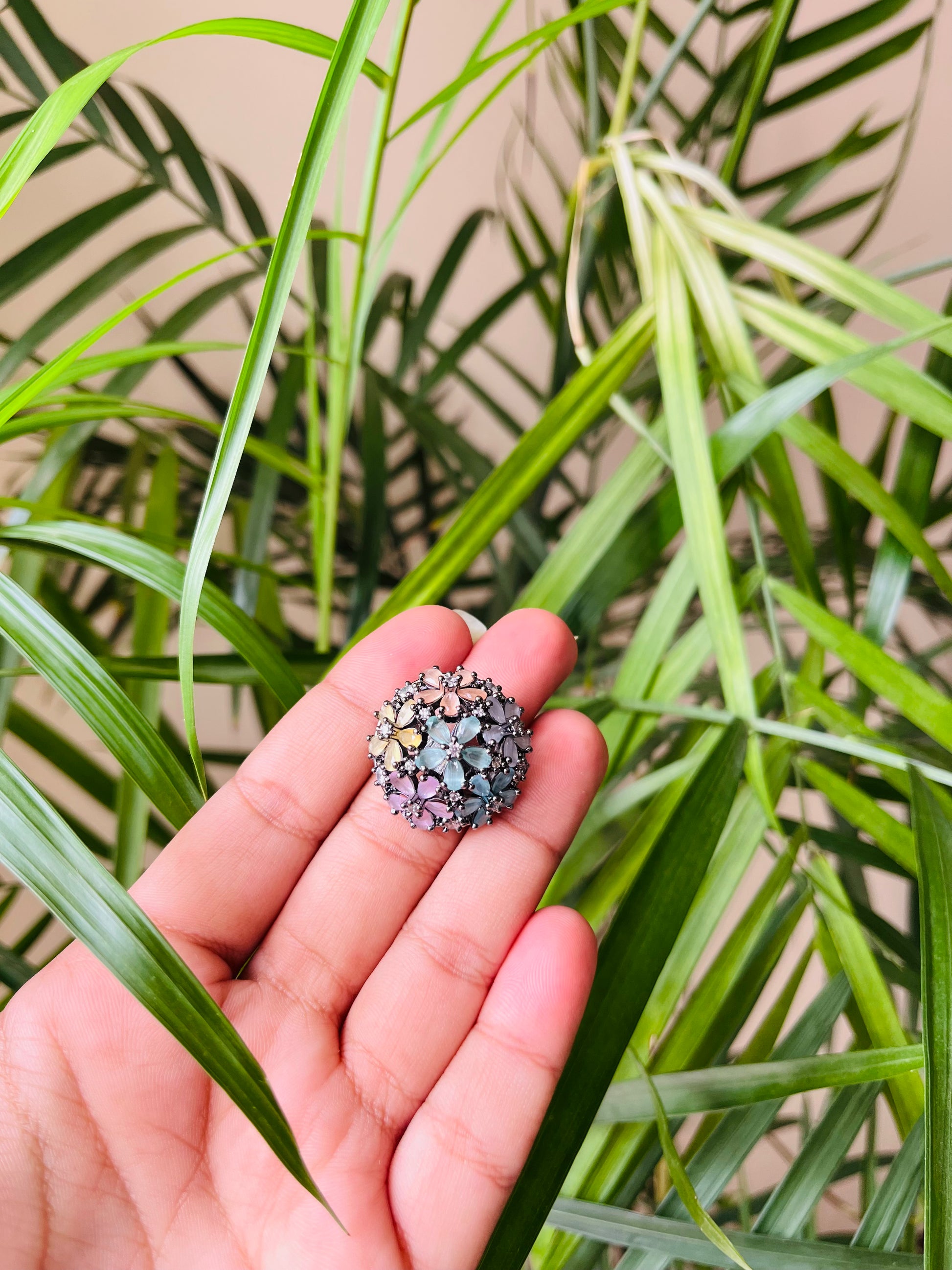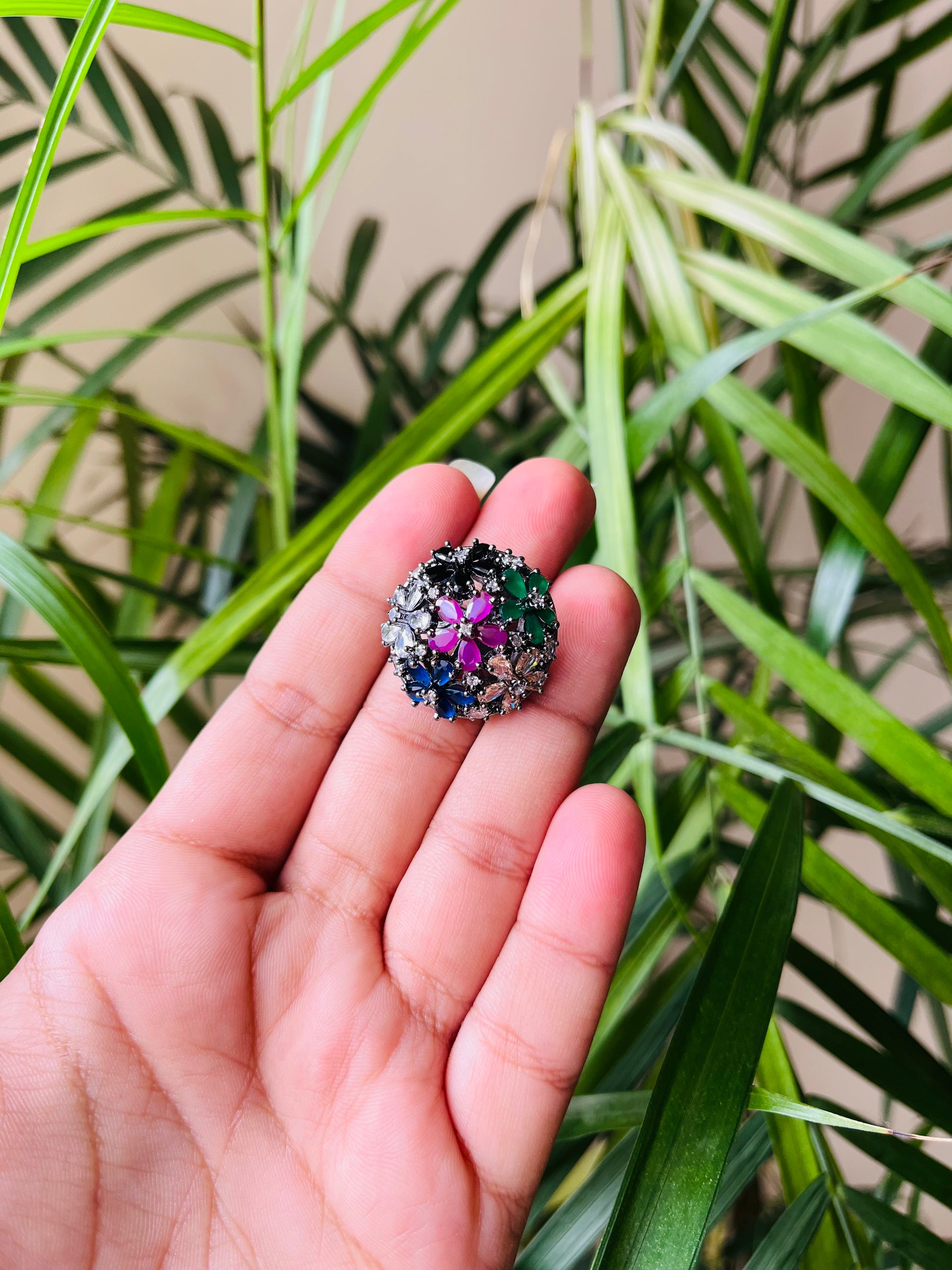 Expertly crafted, this 1 inch round ring features stunning American diamonds and semi-precious stones. With an adjustable fit, this elegant piece offers timeless beauty and versatility, making it the perfect addition to any jewelry collection. Upgrade your style with this high-quality round ring.