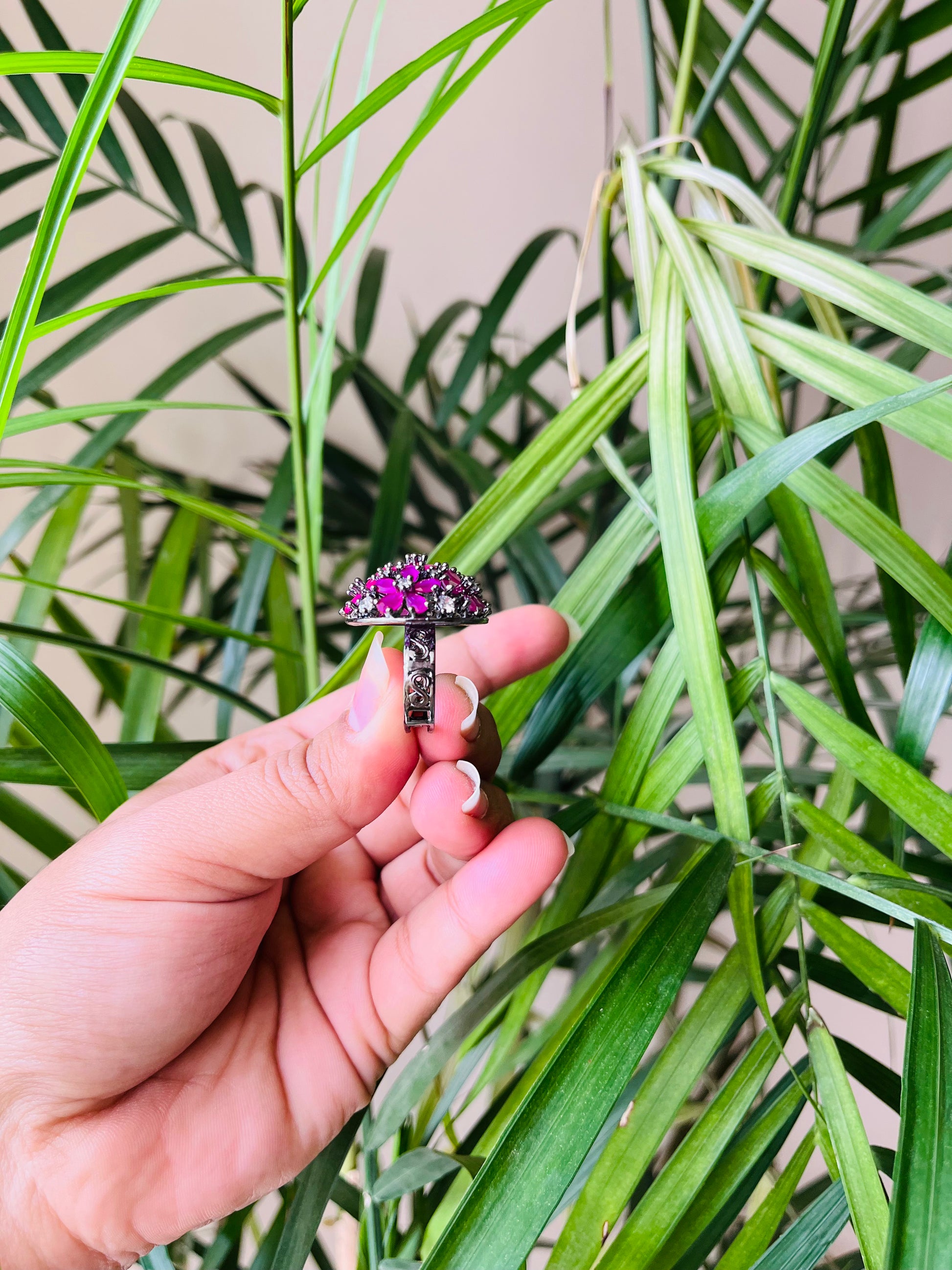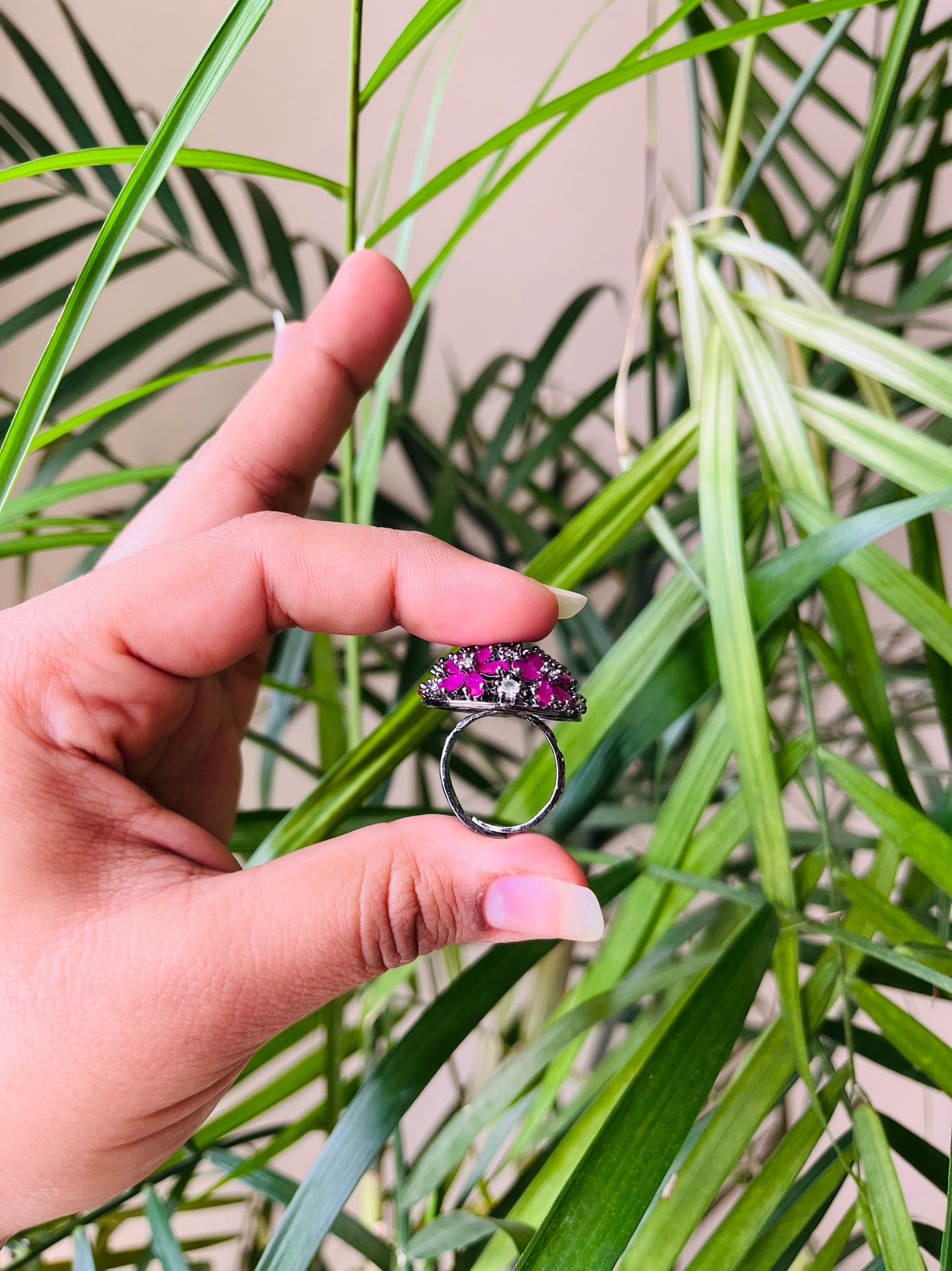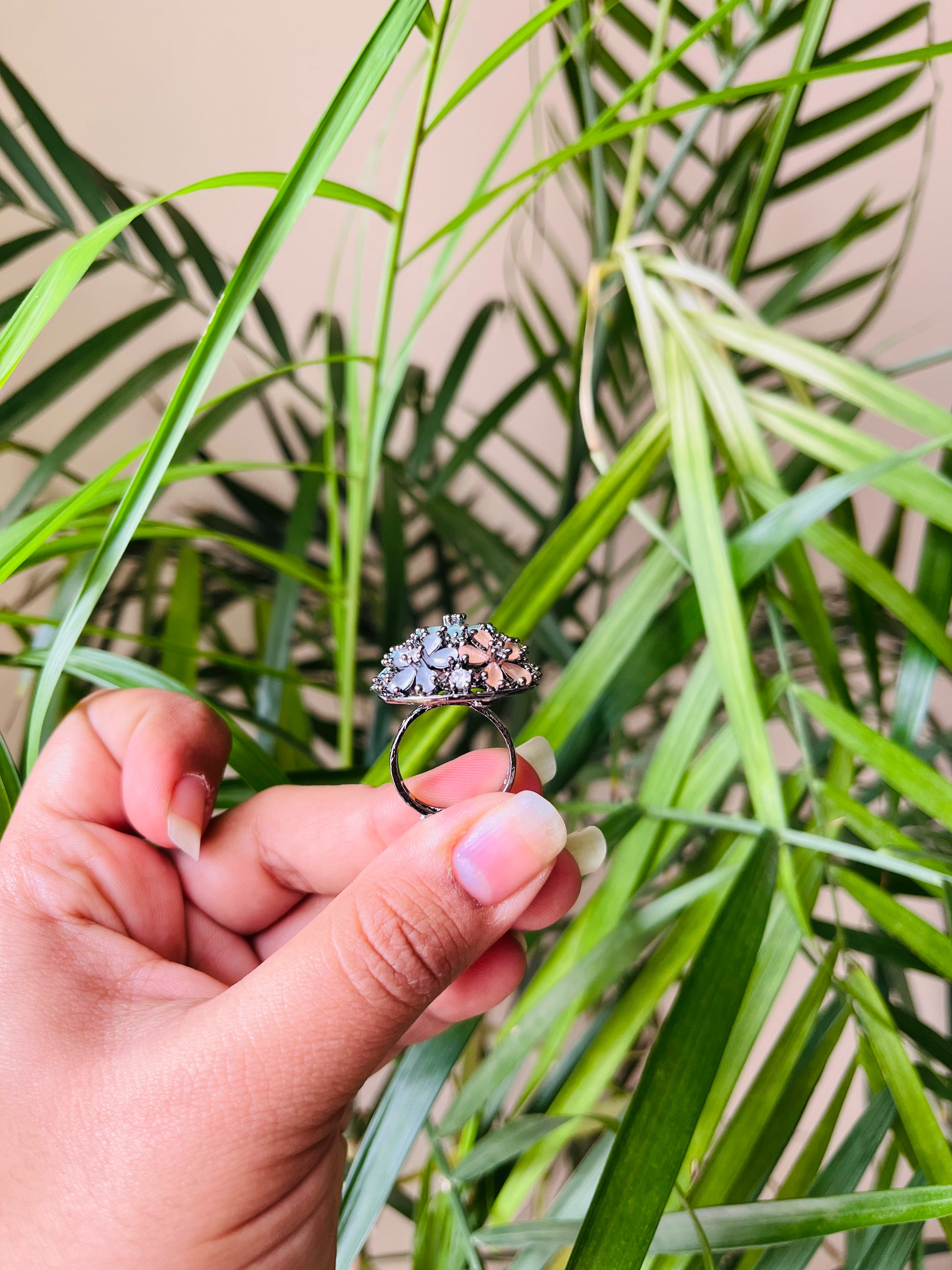 Expertly crafted, this 1 inch round ring features stunning American diamonds and semi-precious stones. With an adjustable fit, this elegant piece offers timeless beauty and versatility, making it the perfect addition to any jewelry collection. Upgrade your style with this high-quality round ring.