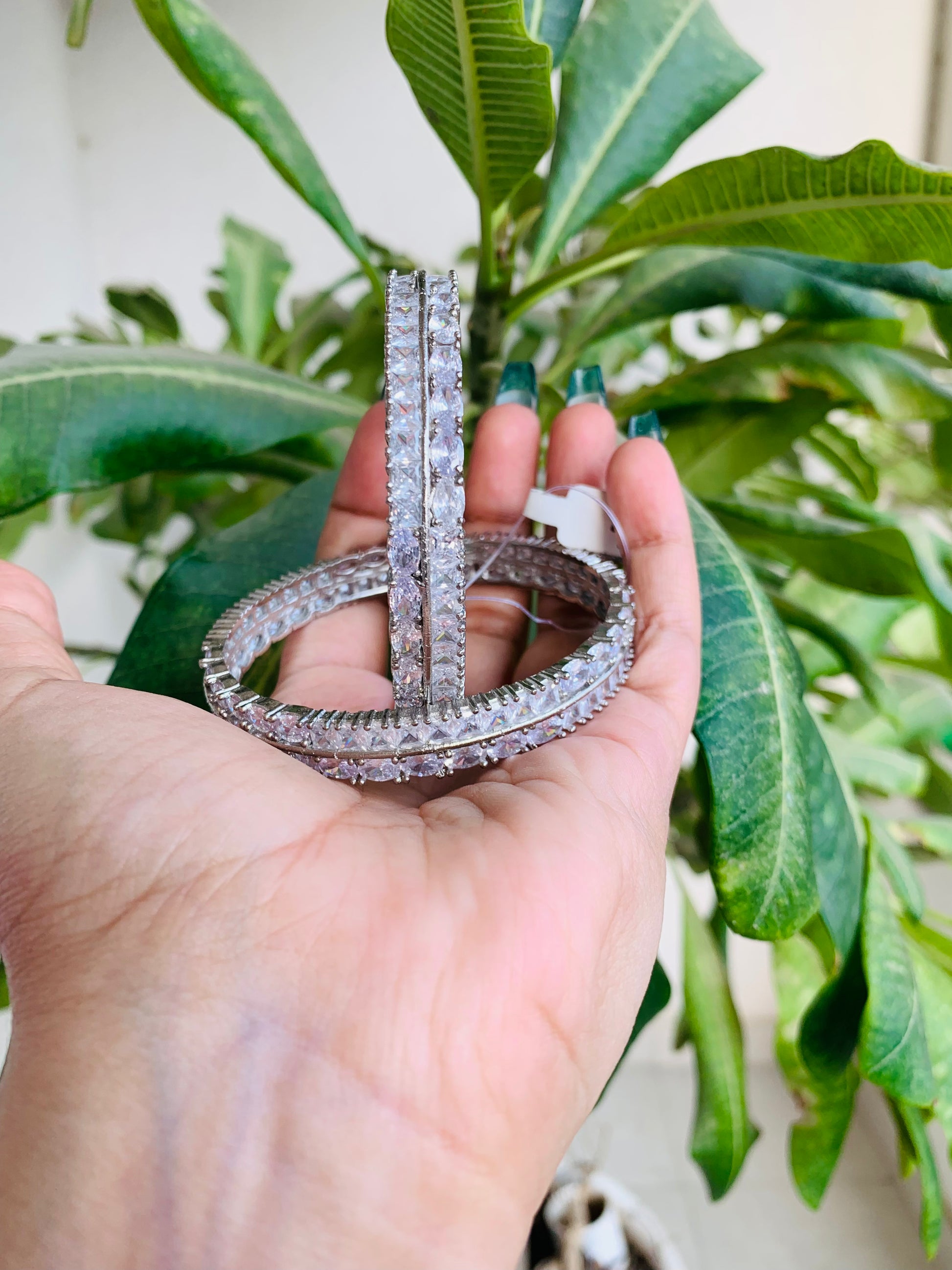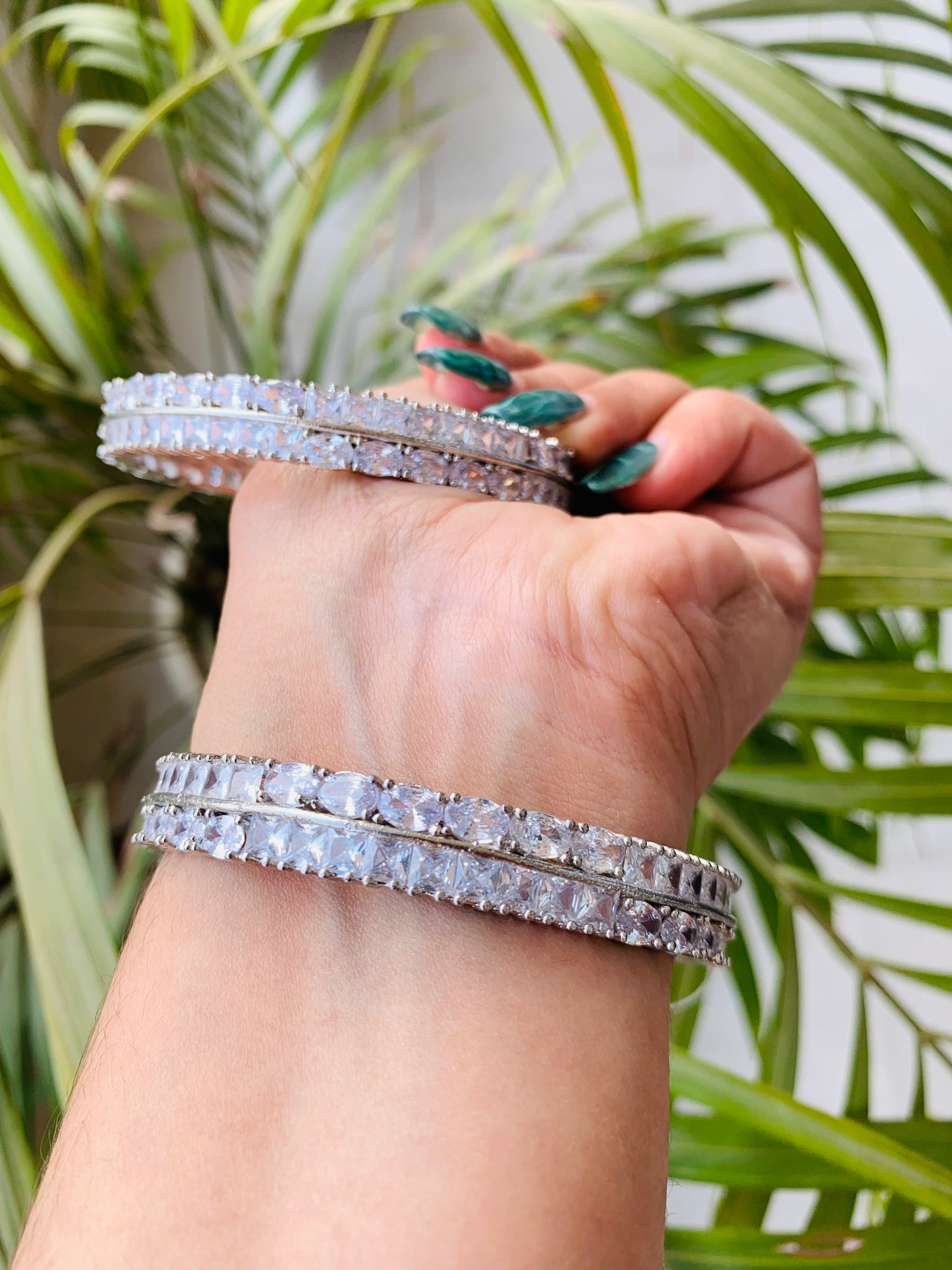 Elevate your style with our American Diamond Bangles. Crafted with premium quality American diamonds and finished with a lustrous rhodium polish, these bangles are sure to add a touch of elegance to any outfit. Available in size 2.8.