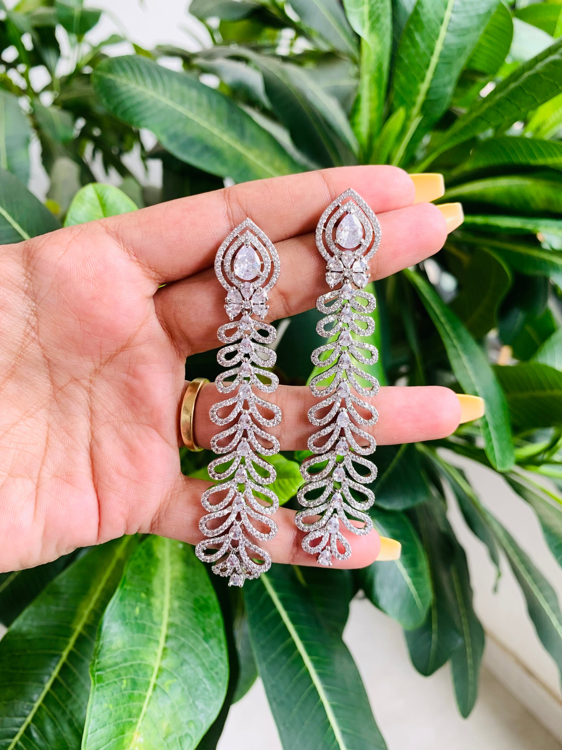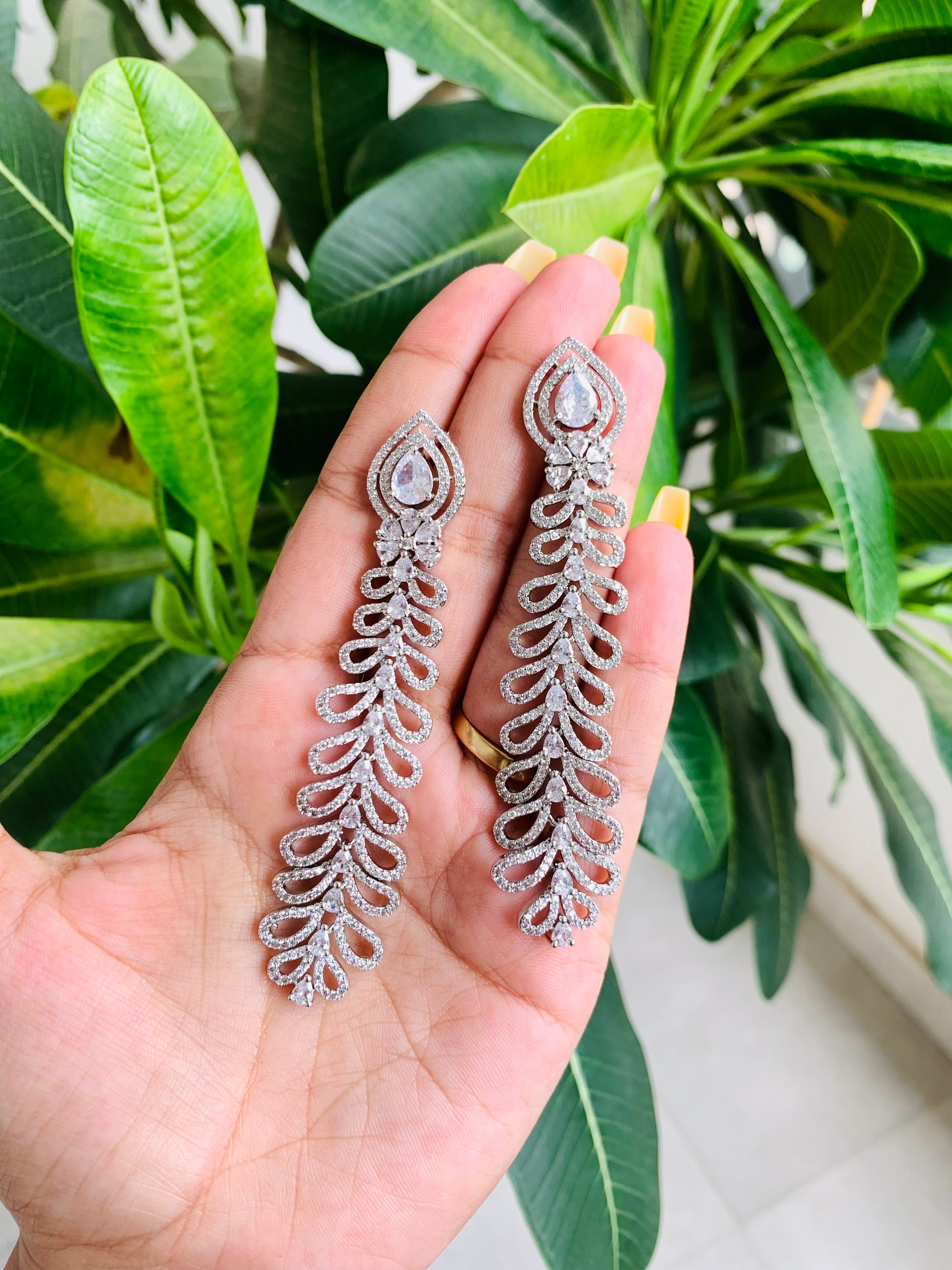 These elegant American Diamond Long Danglers feature real-looking stones for a shiny and sophisticated look. These danglers are perfect for any occasion as they add a touch of glamour to your outfit.