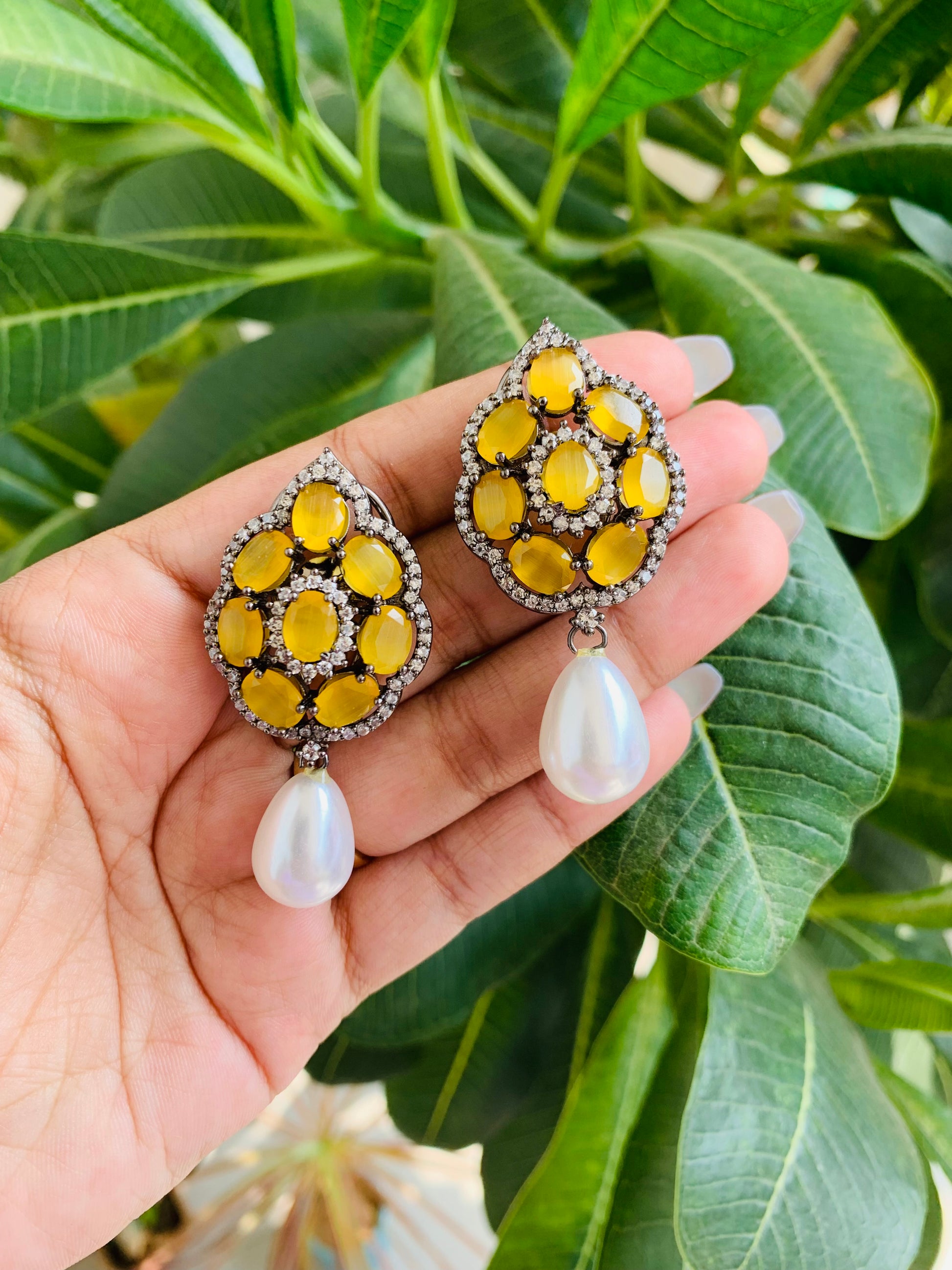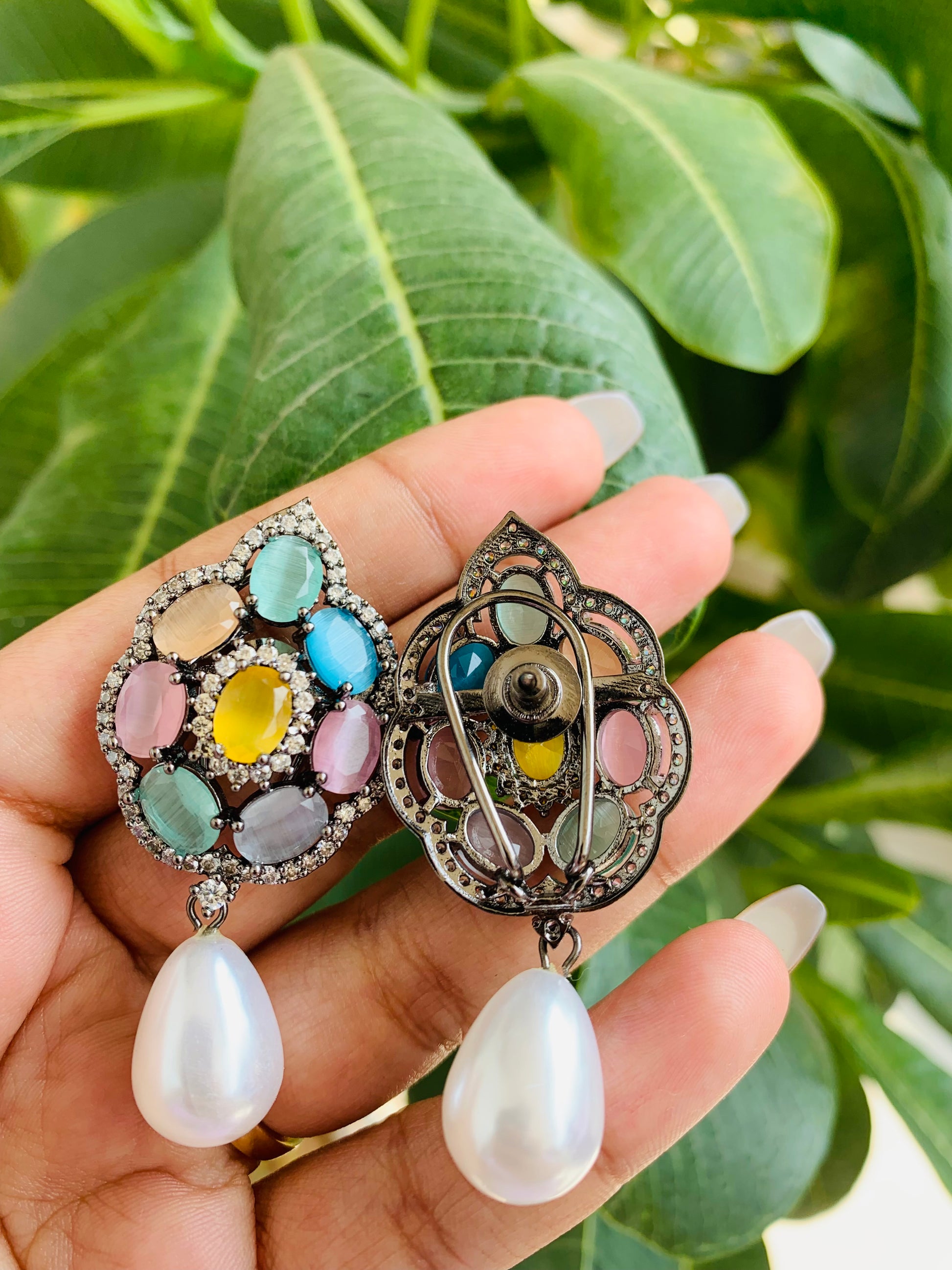 Super classy big-size multicolor studs with a pearl drop. These come with a clip back for great support and fit.