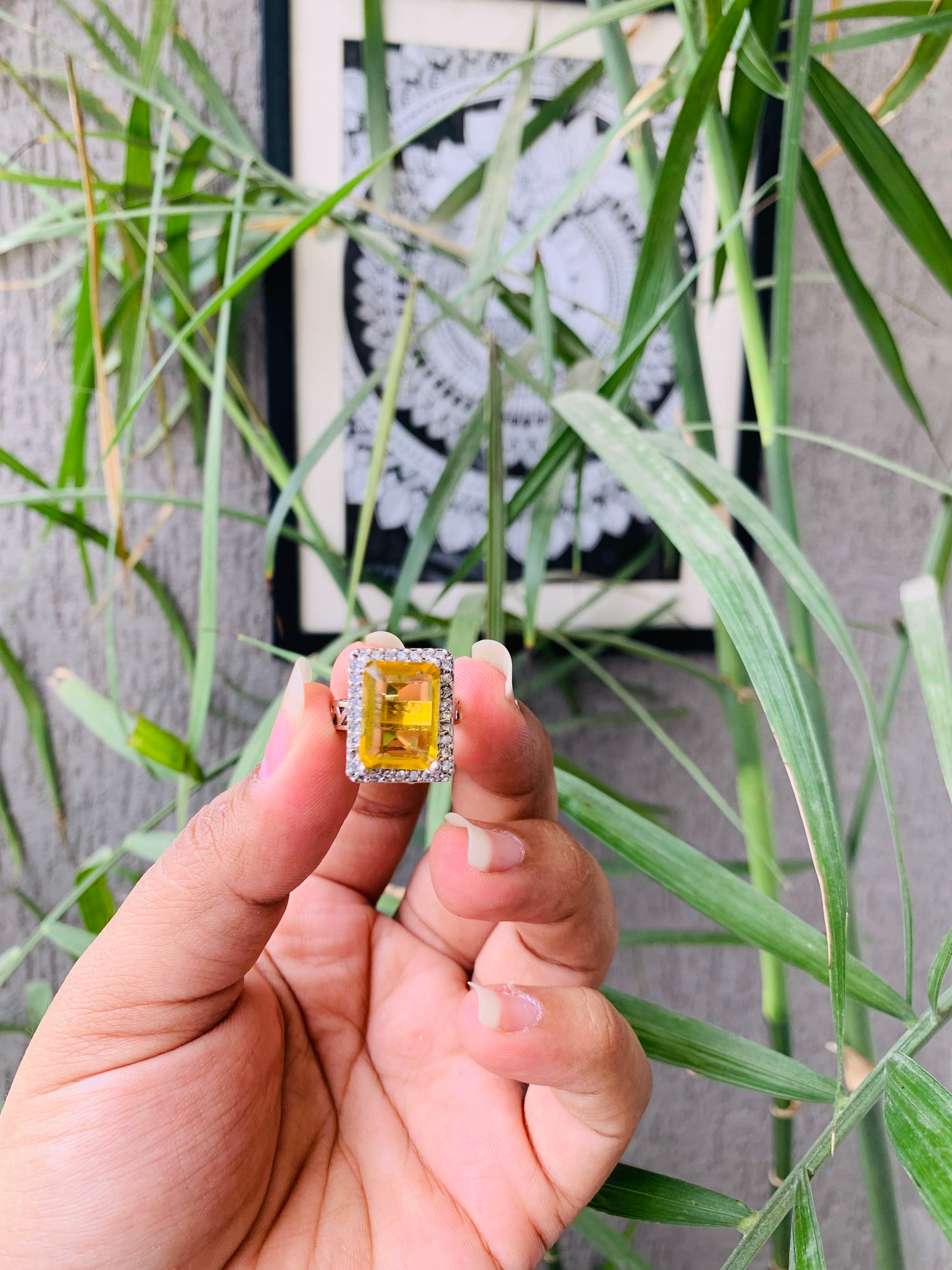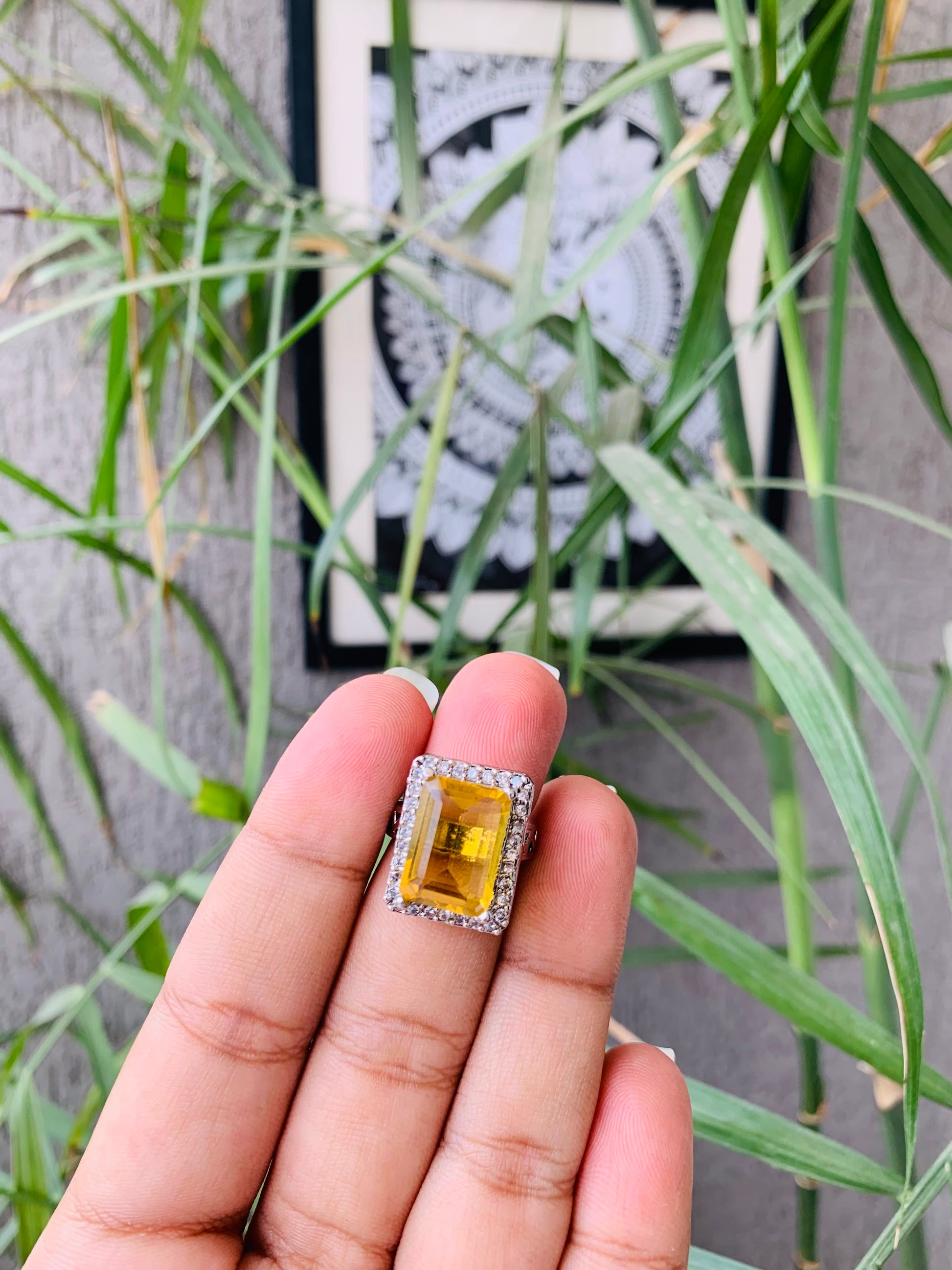 This stunning cocktail ring features a bold yellow stone surrounded by shimmering American diamonds. This unique piece is sure to make a statement and add a touch of glamour to any outfit. Crafted with expert precision and quality materials, this ring is perfect for any special occasion.