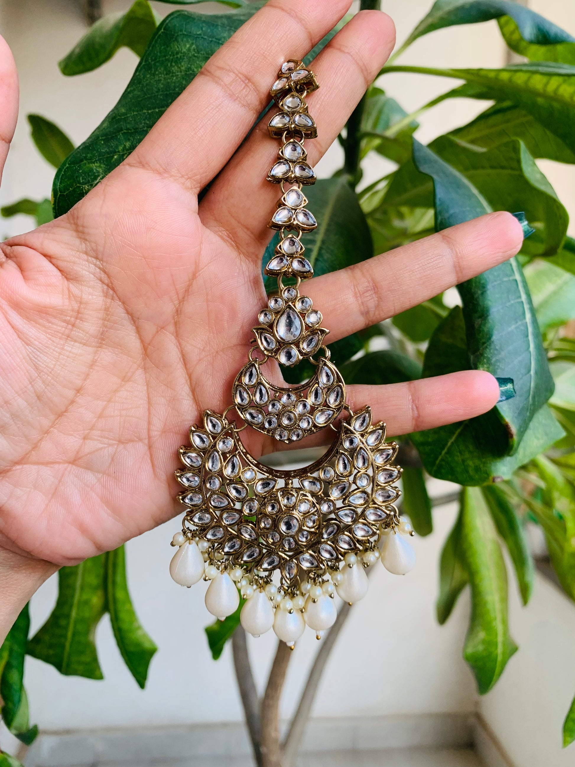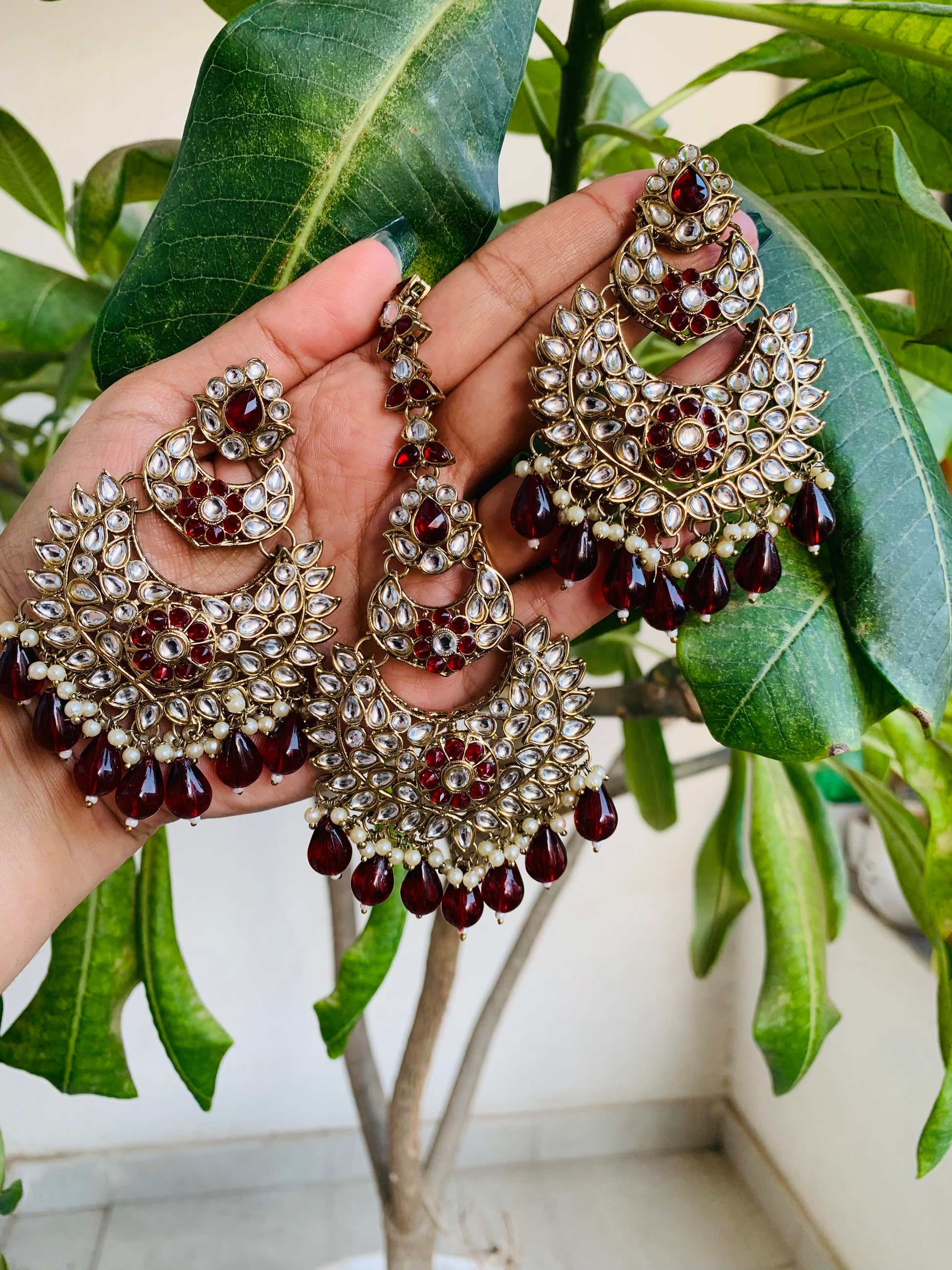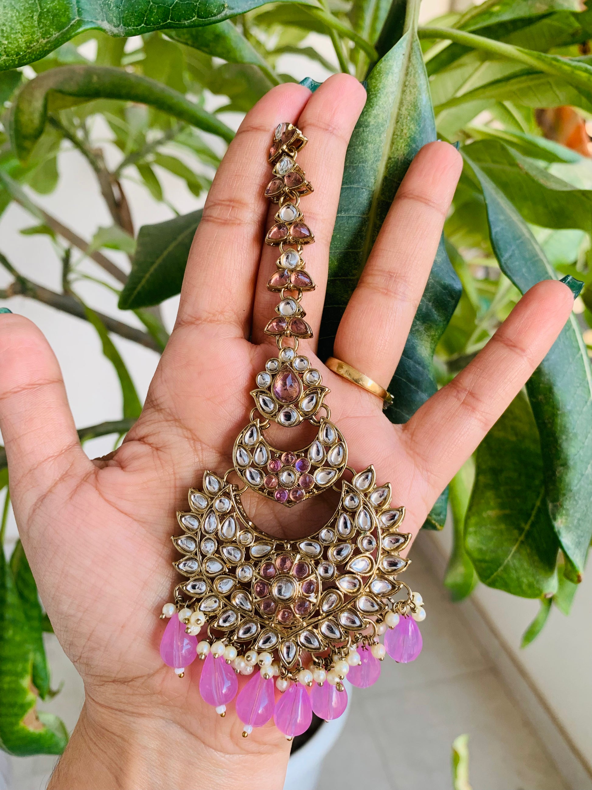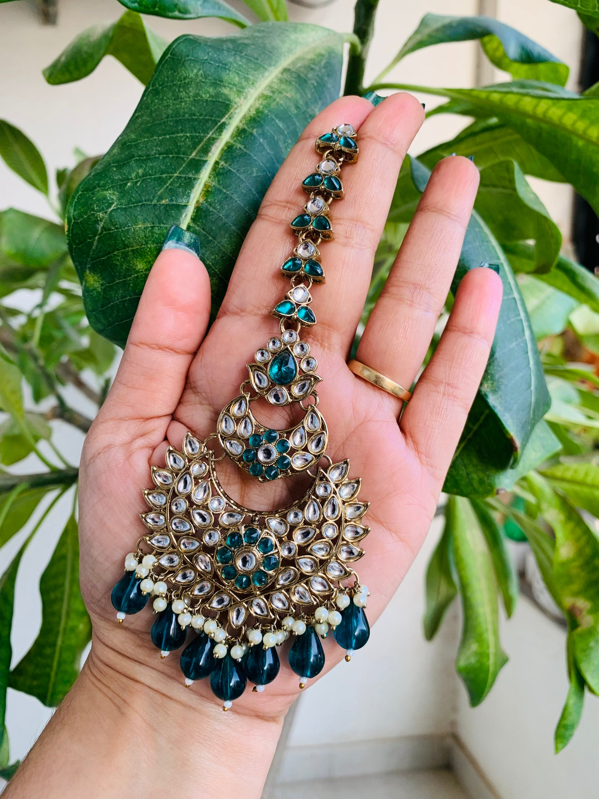 Discover elegance and tradition with our ChaandBaali earrings complemented by a Maang Tika. Adorned with Kundan, these traditional accessories add a touch of sophistication to any outfit. Perfect for special occasions.