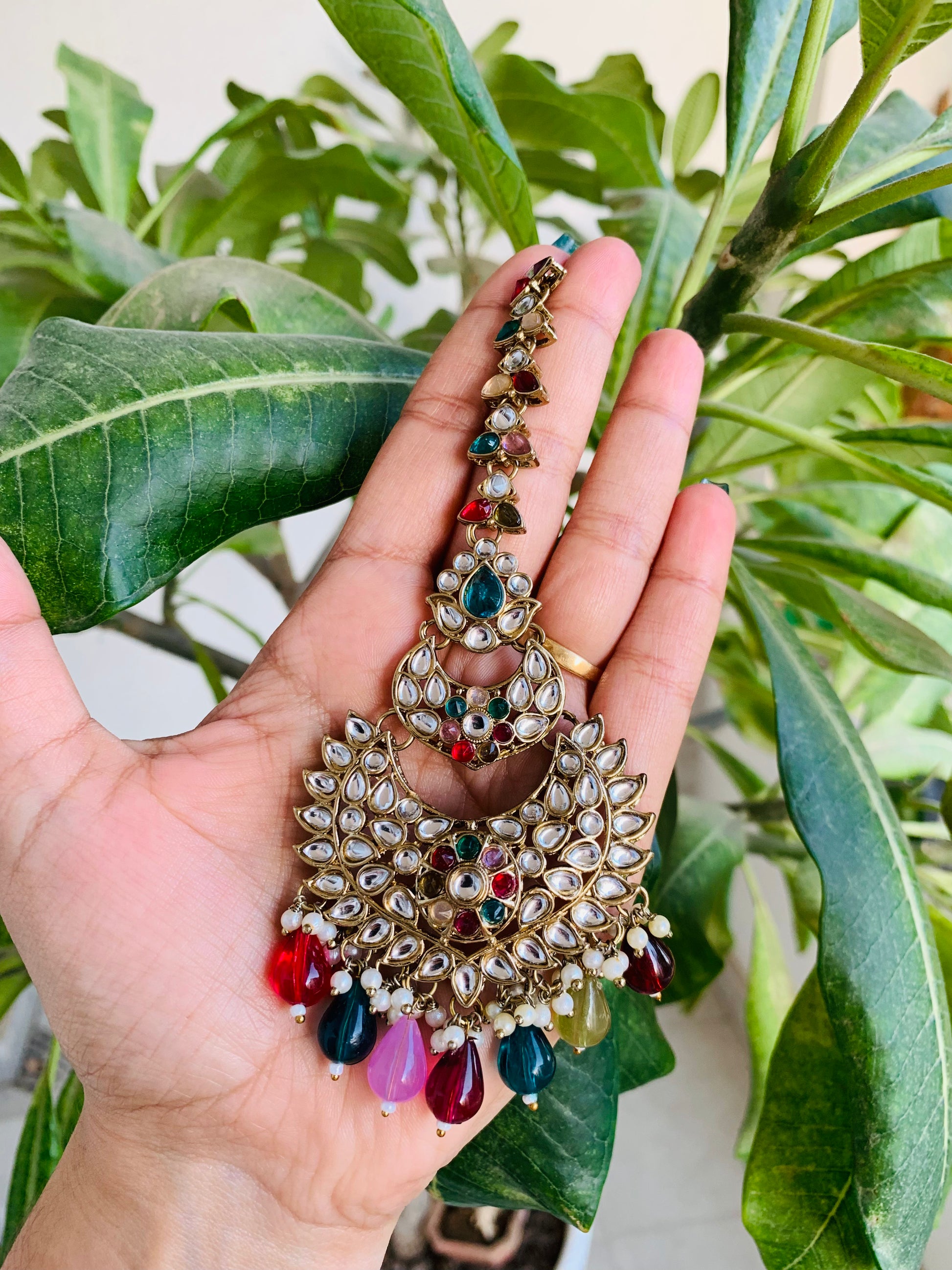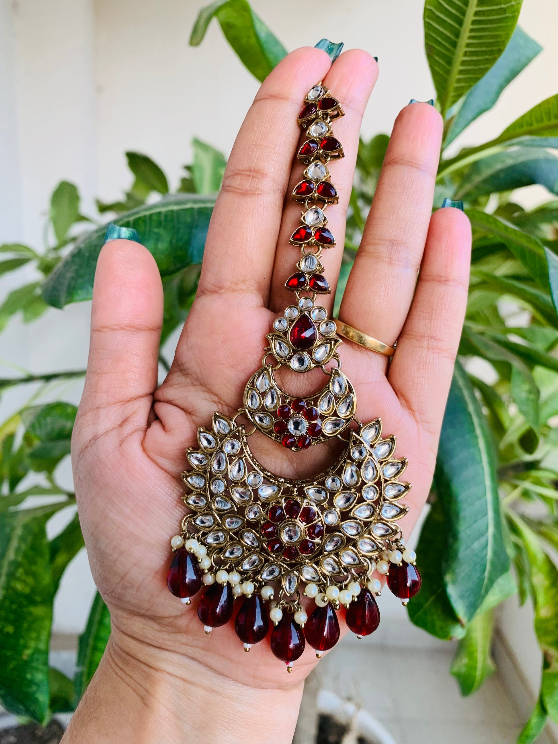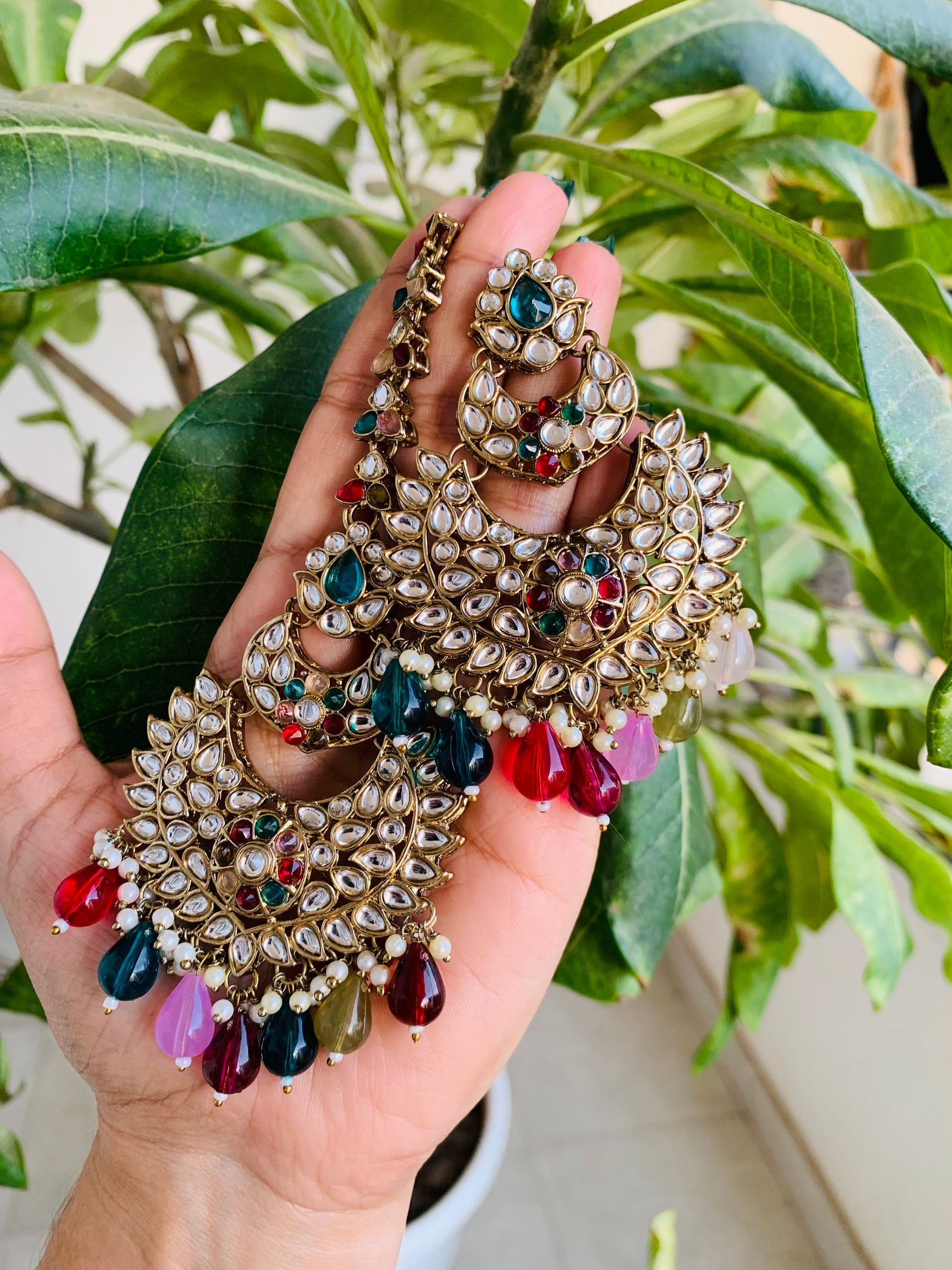 Discover elegance and tradition with our ChaandBaali earrings complemented by a Maang Tika. Adorned with Kundan, these traditional accessories add a touch of sophistication to any outfit. Perfect for special occasions.