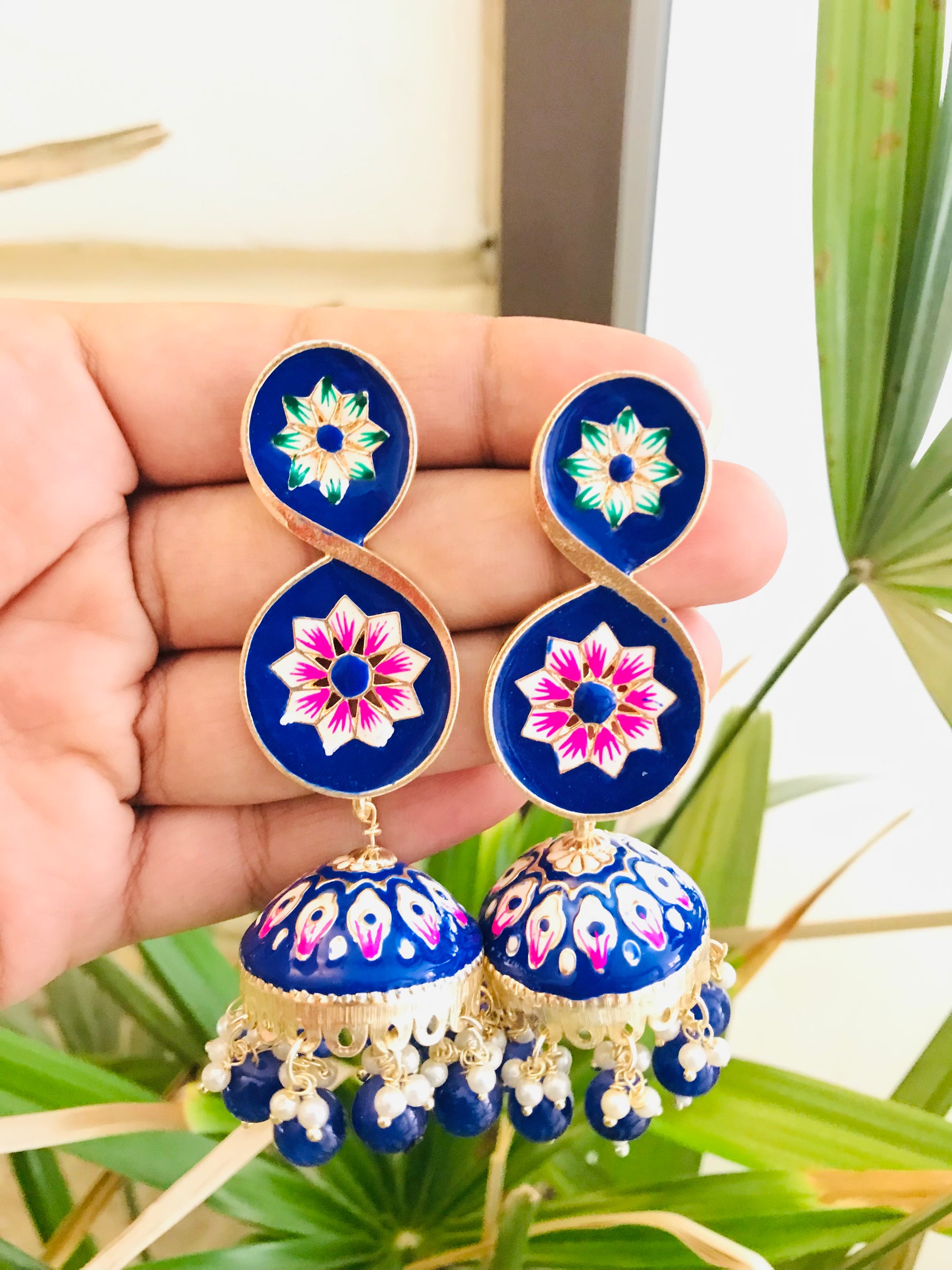 This is one of the most beautiful meenakari-style earrings you'll see in our collection! A unique design stud with beautiful jhumkas. This is the perfect piece for the upcoming festive season.