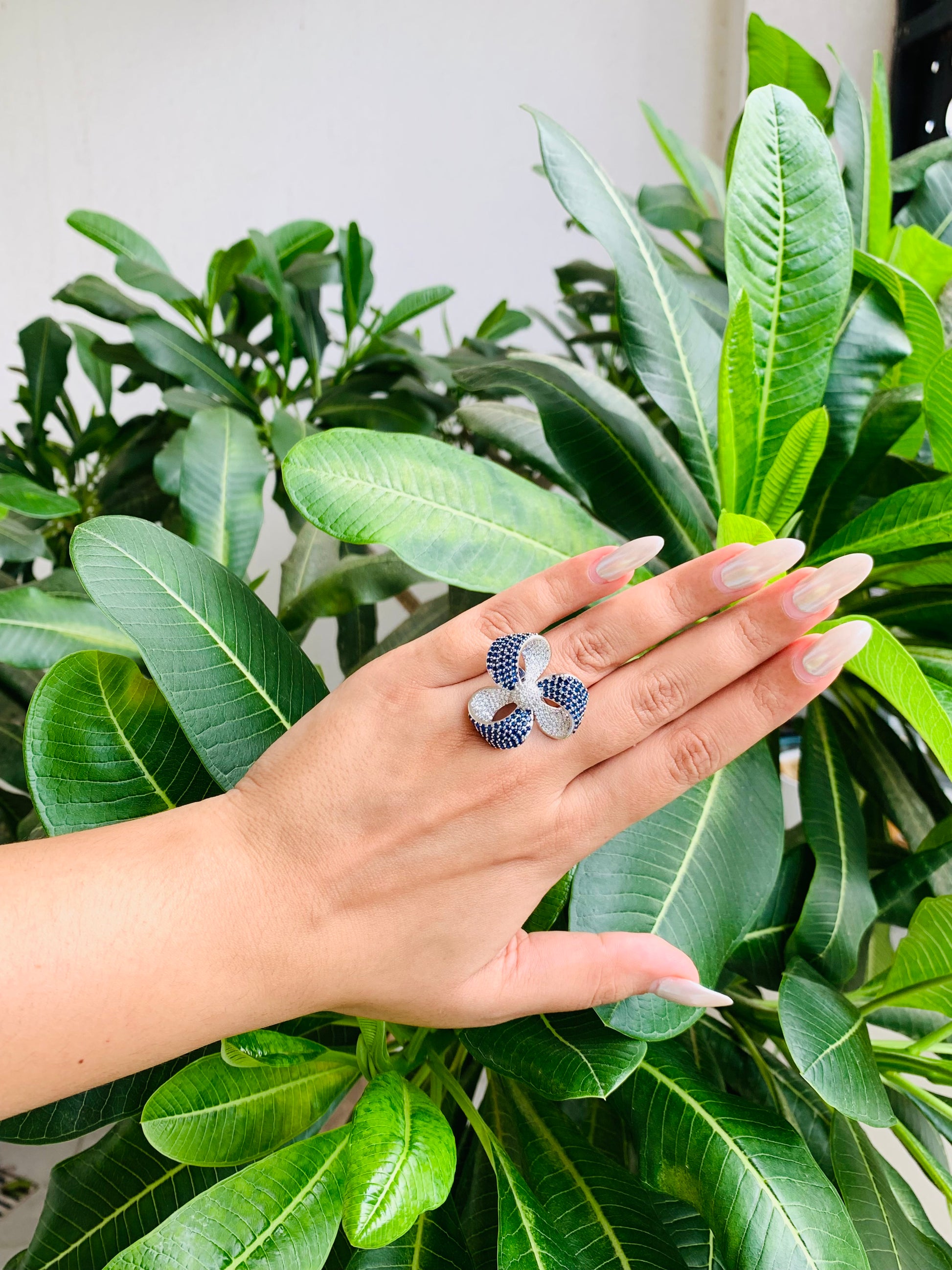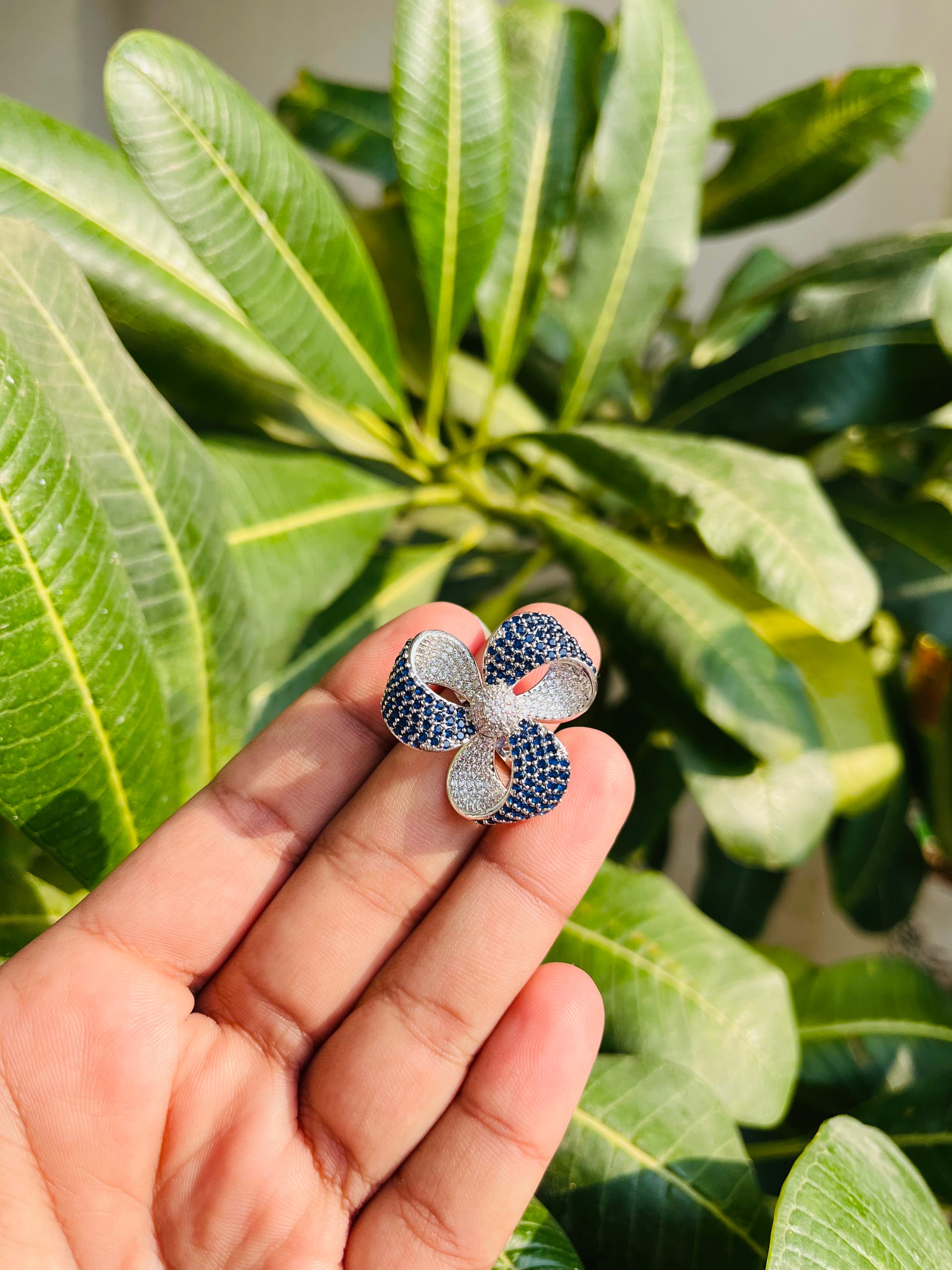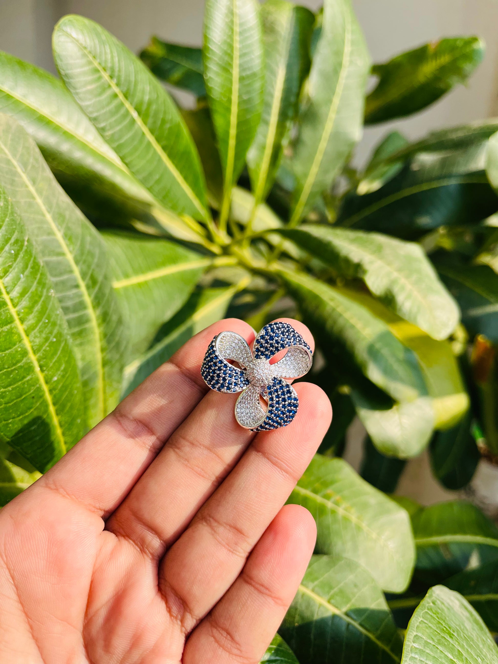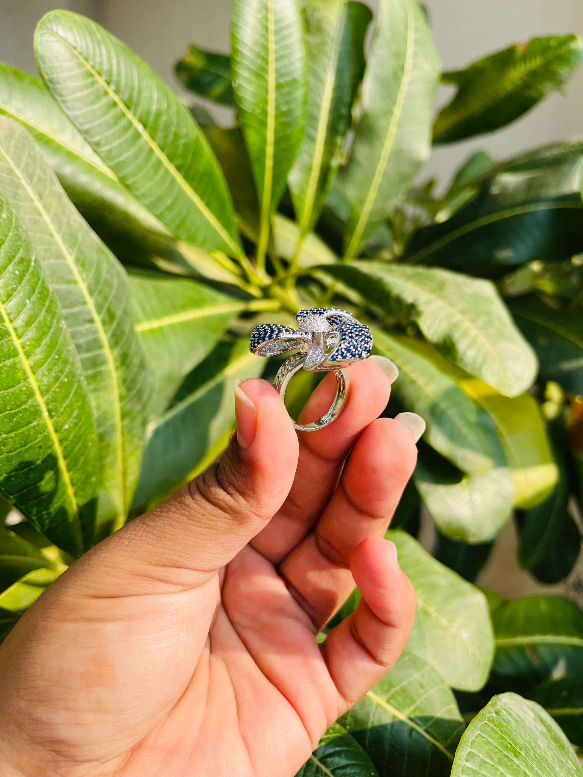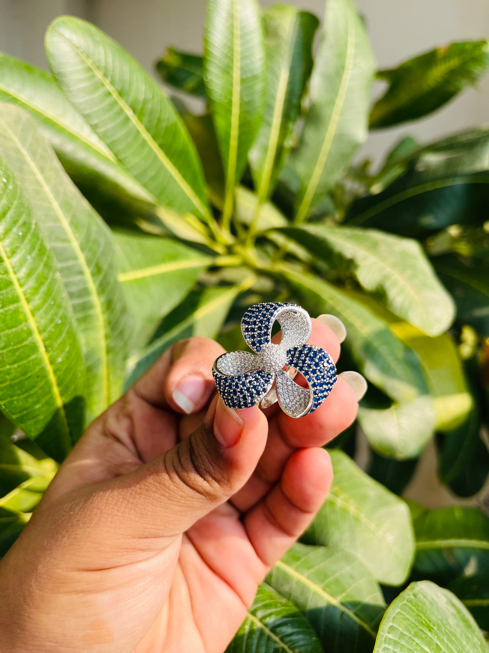 Crafted with precision, this Designer Micro AD Blue Ring showcases a stunning round center with embedded stones. The blue and silver micro AD, paired with rounded edges, adds a touch of elegance to the exquisite folder leaf pattern. An impeccable choice for those seeking a beautiful and unique design.