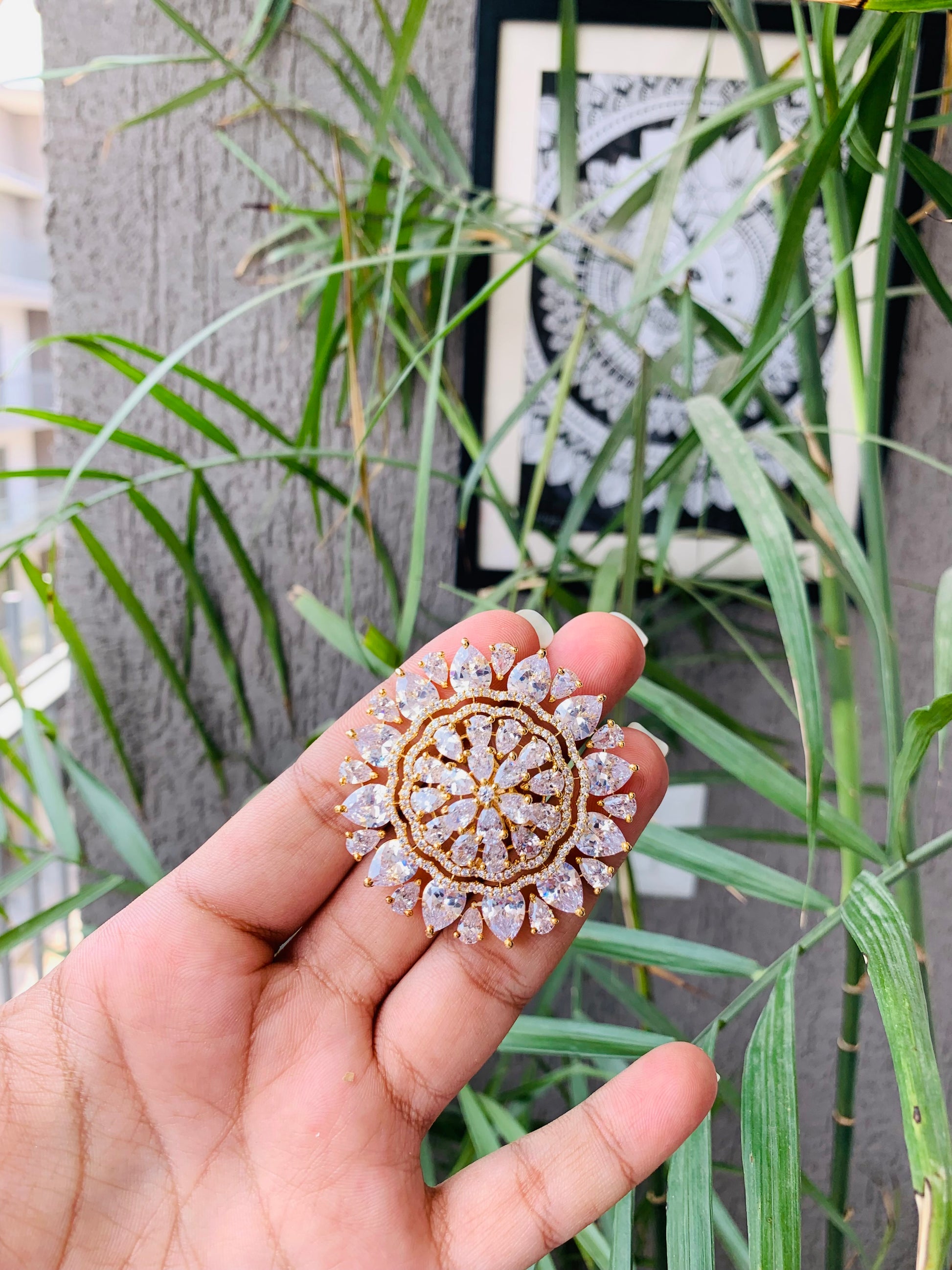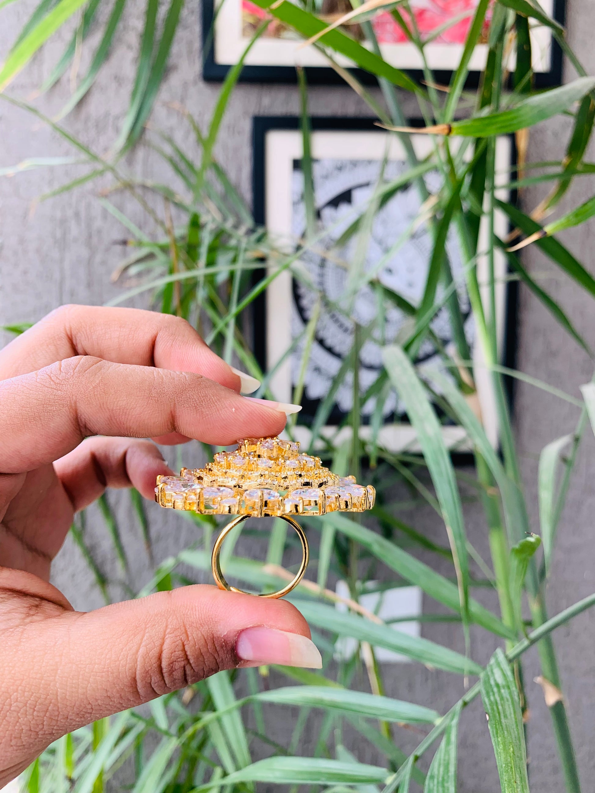 Expertly handcrafted with intricate floral design and encrusted with high-quality AD stones, this statement ring adds a touch of elegance to any outfit. Made with premium materials, it's the perfect accessory for any occasion. Experience the beauty and sophistication of this stunning ring.