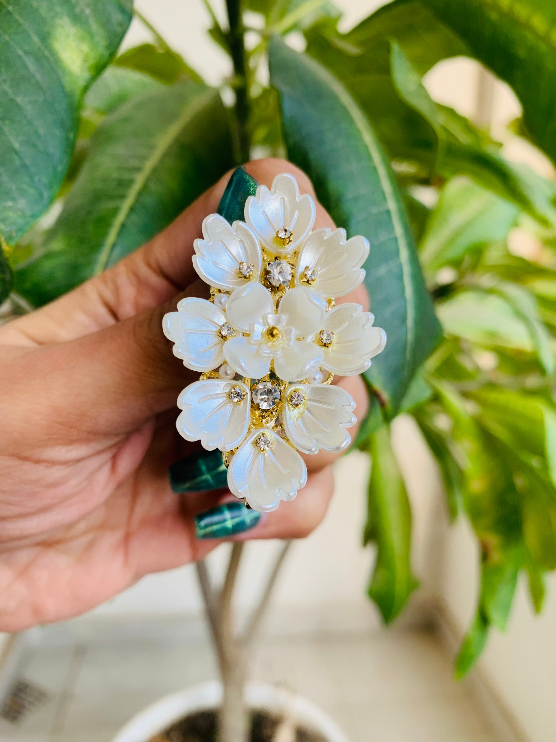 This Flower Shaped Stud features beautiful pearls and is made with top-notch quality materials. Enjoy a unique and elegant look with this exquisite piece. Upgrade your accessory game with a touch of sophistication.