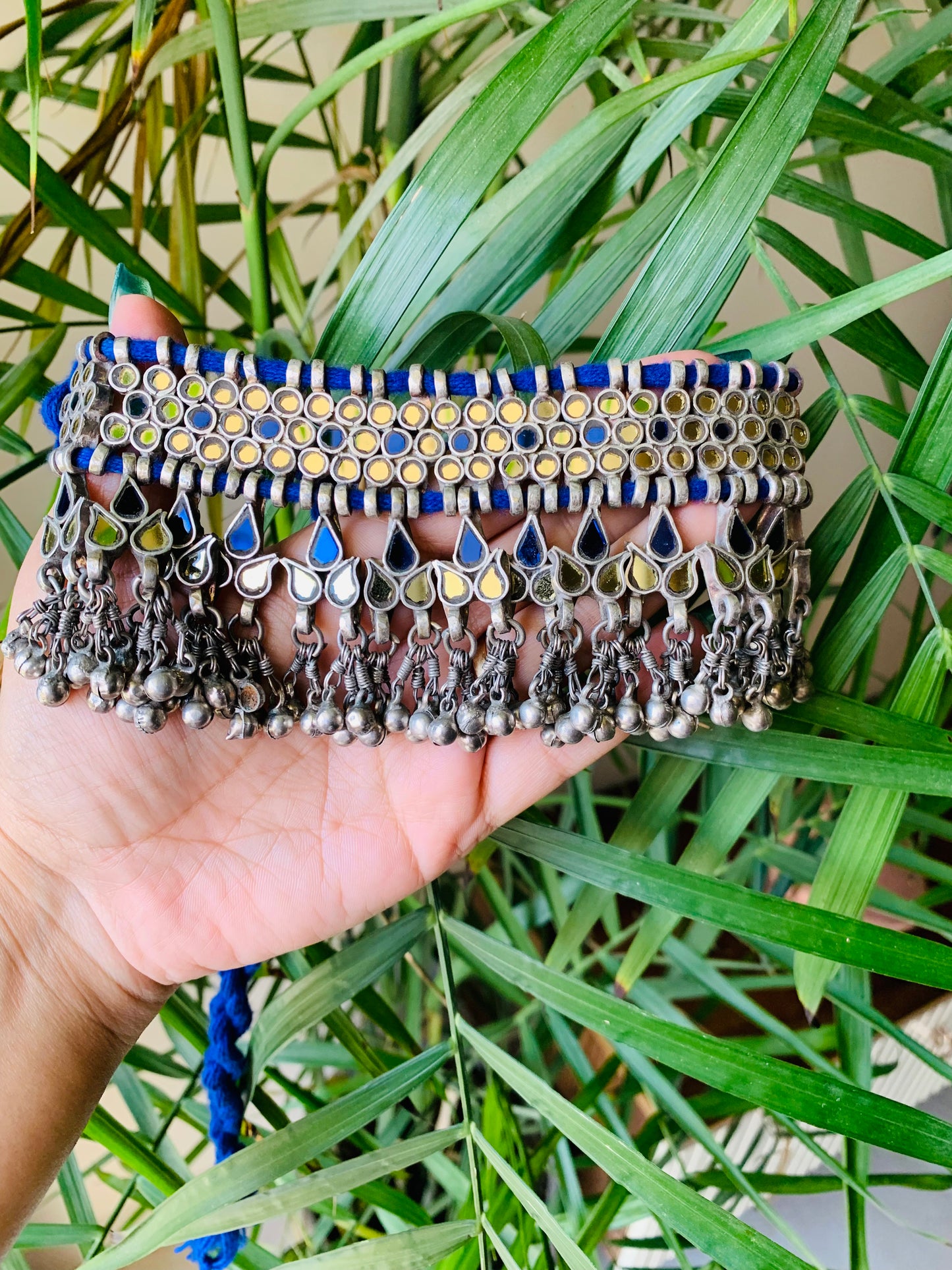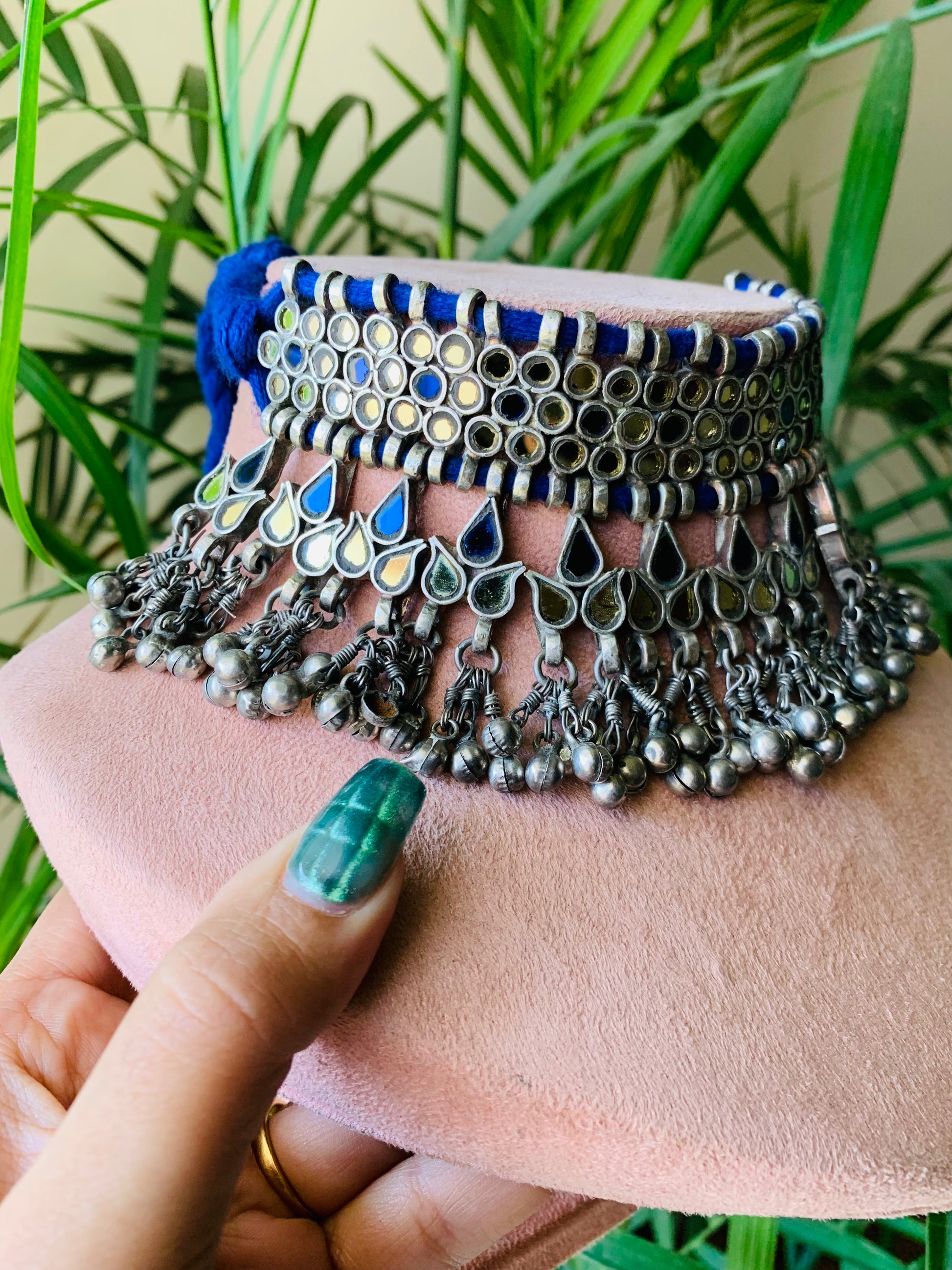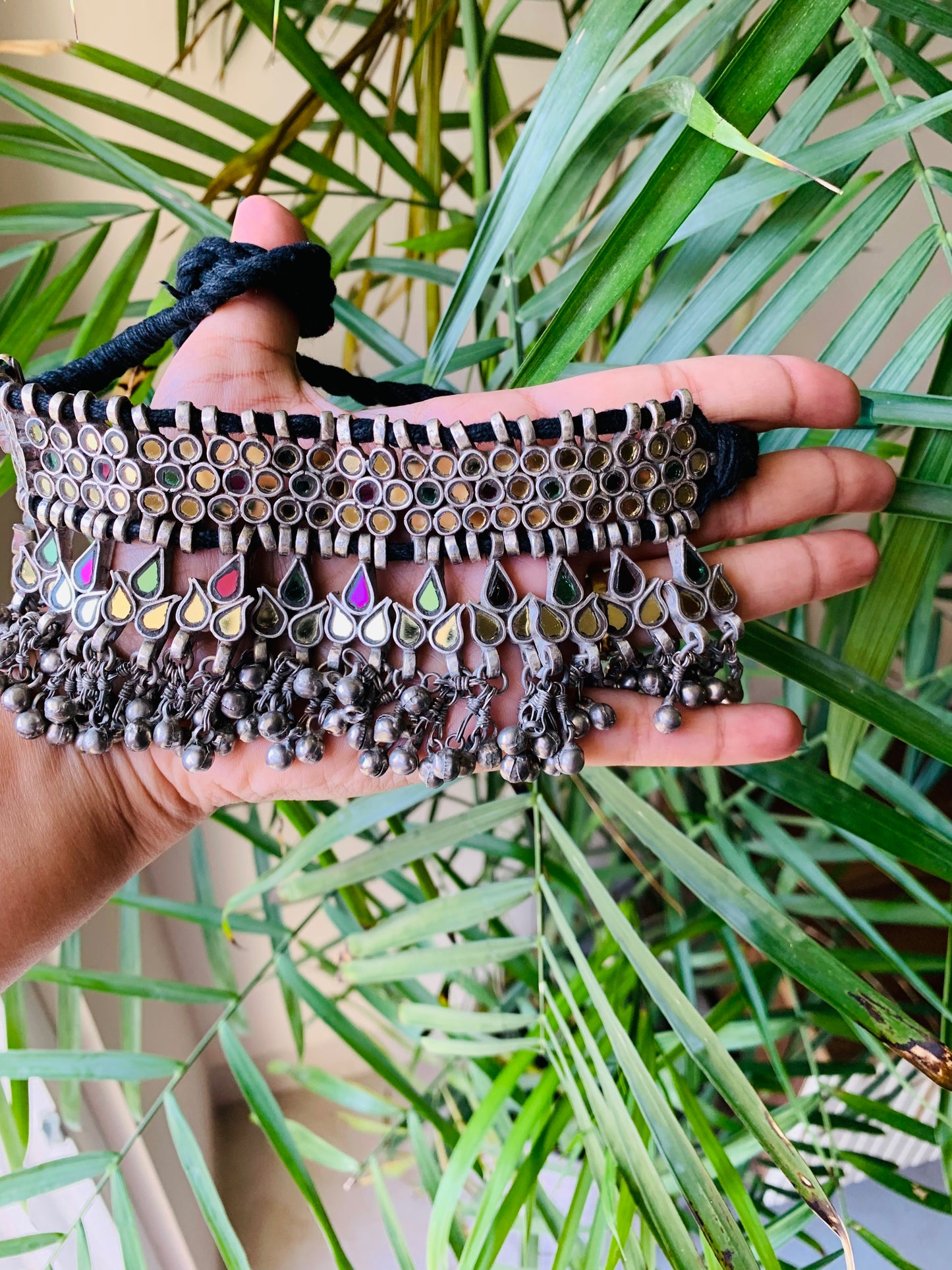 This Ghungroo Drops Choker features a unique thread closure and intricate round and leaf-shaped design. Adorned with bunches of Ghungroo, this choker adds a touch of elegance to any outfit. Perfect for those looking for a statement piece that blends traditional and modern styles.