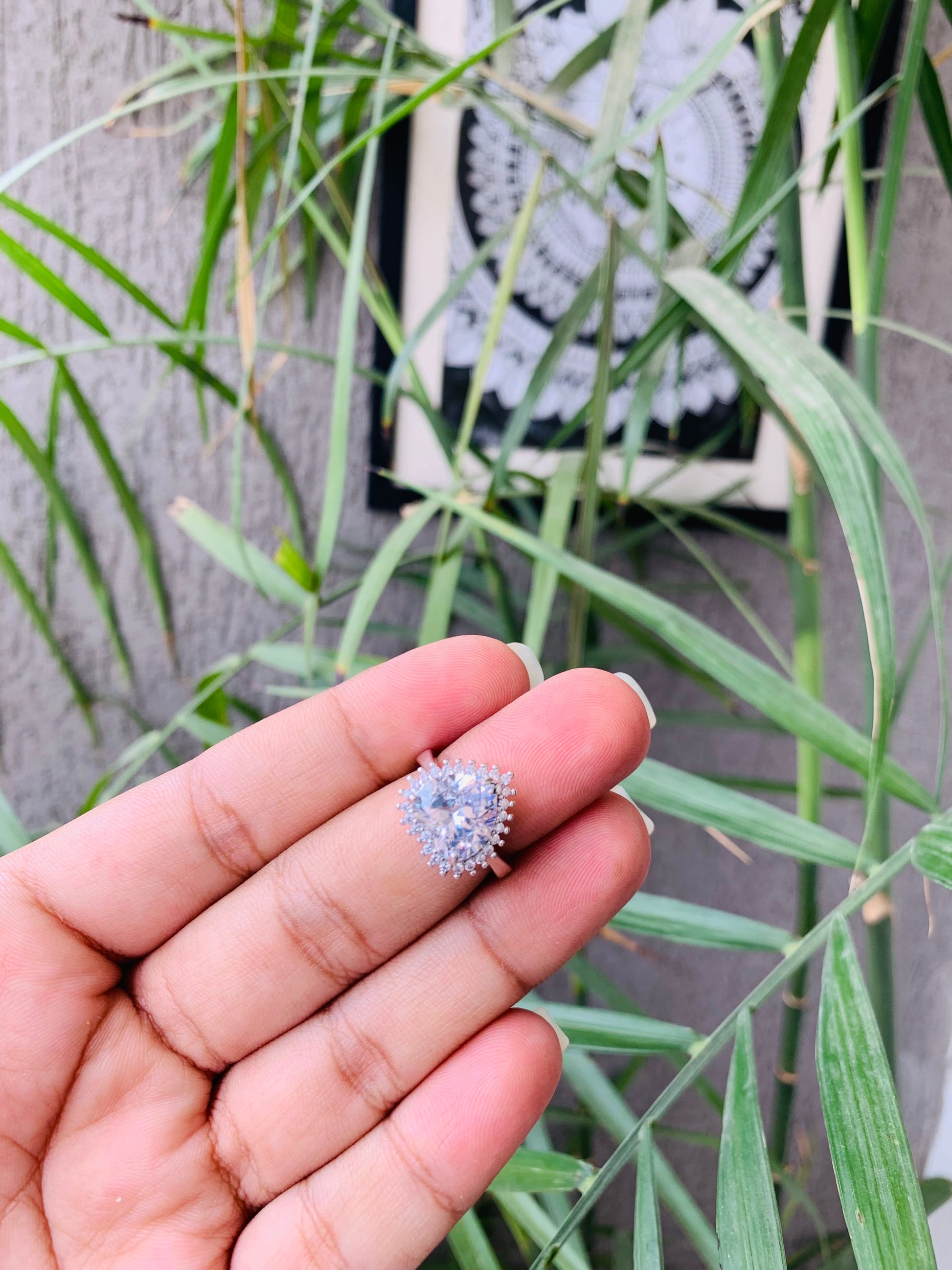 This heart-shaped AD ring is expertly crafted for a stunning and elegant design. With its unique shape and sparkling stones, it is the perfect accessory to add a touch of sophistication to any outfit. Show your love and style with this beautiful ring.