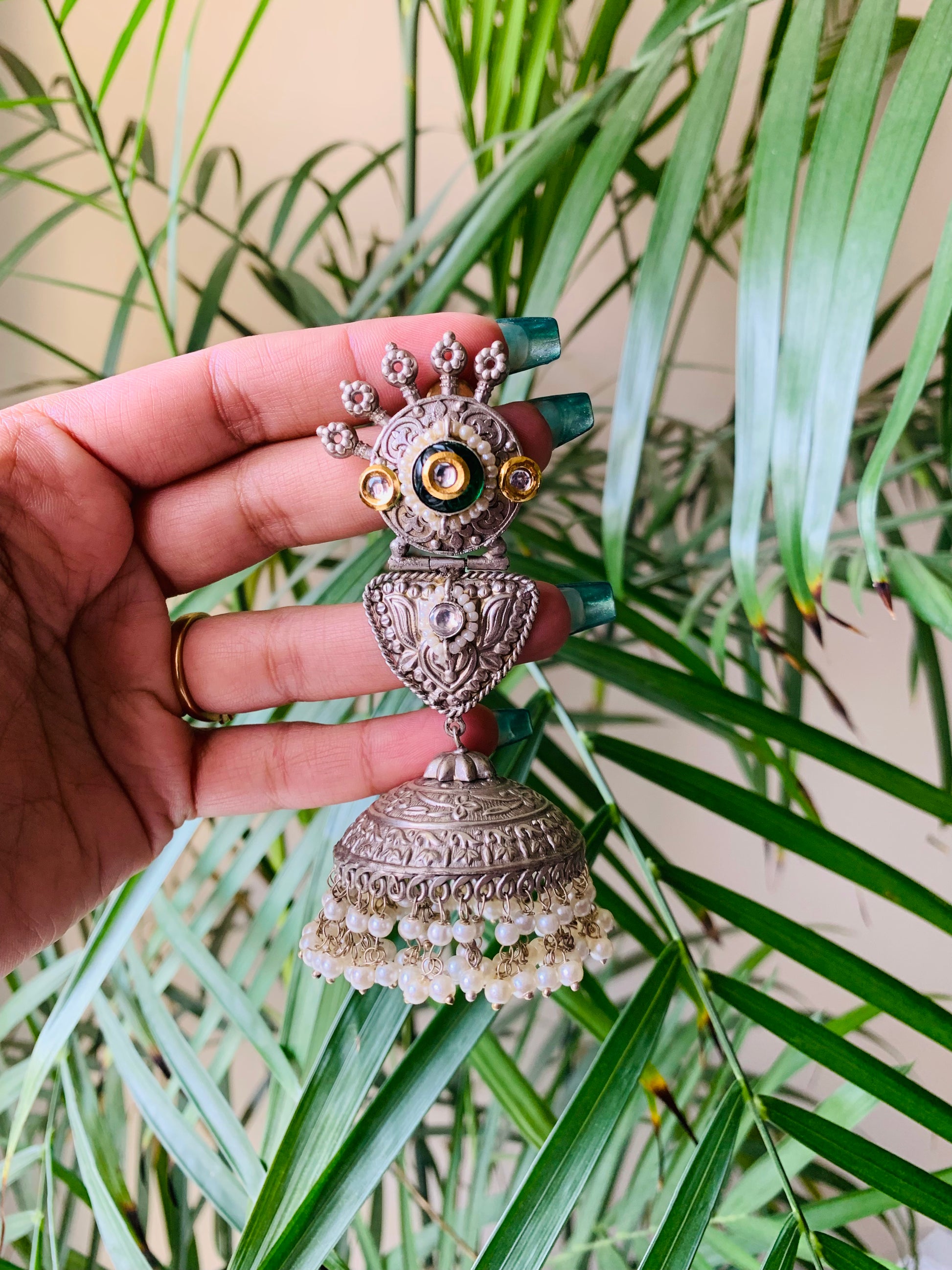 This Jumbo Peacock Jaipuri Jhumla boasts an elegant peacock style design adorned with kundan and pearls for a luxurious and stylish look. Made with a silver look alike material, this piece exudes sophistication and charm. Elevate your outfit with this statement jewelry piece.