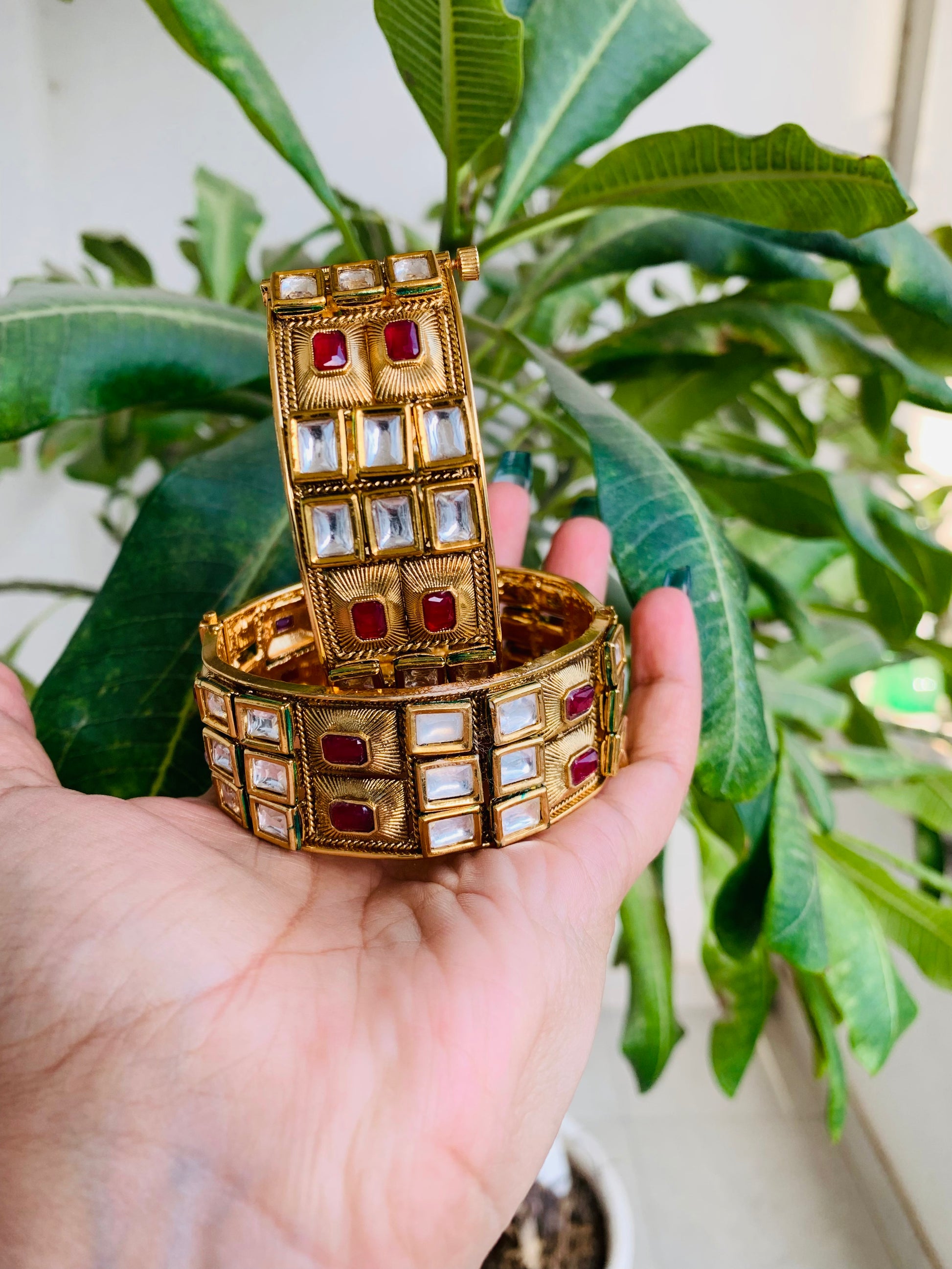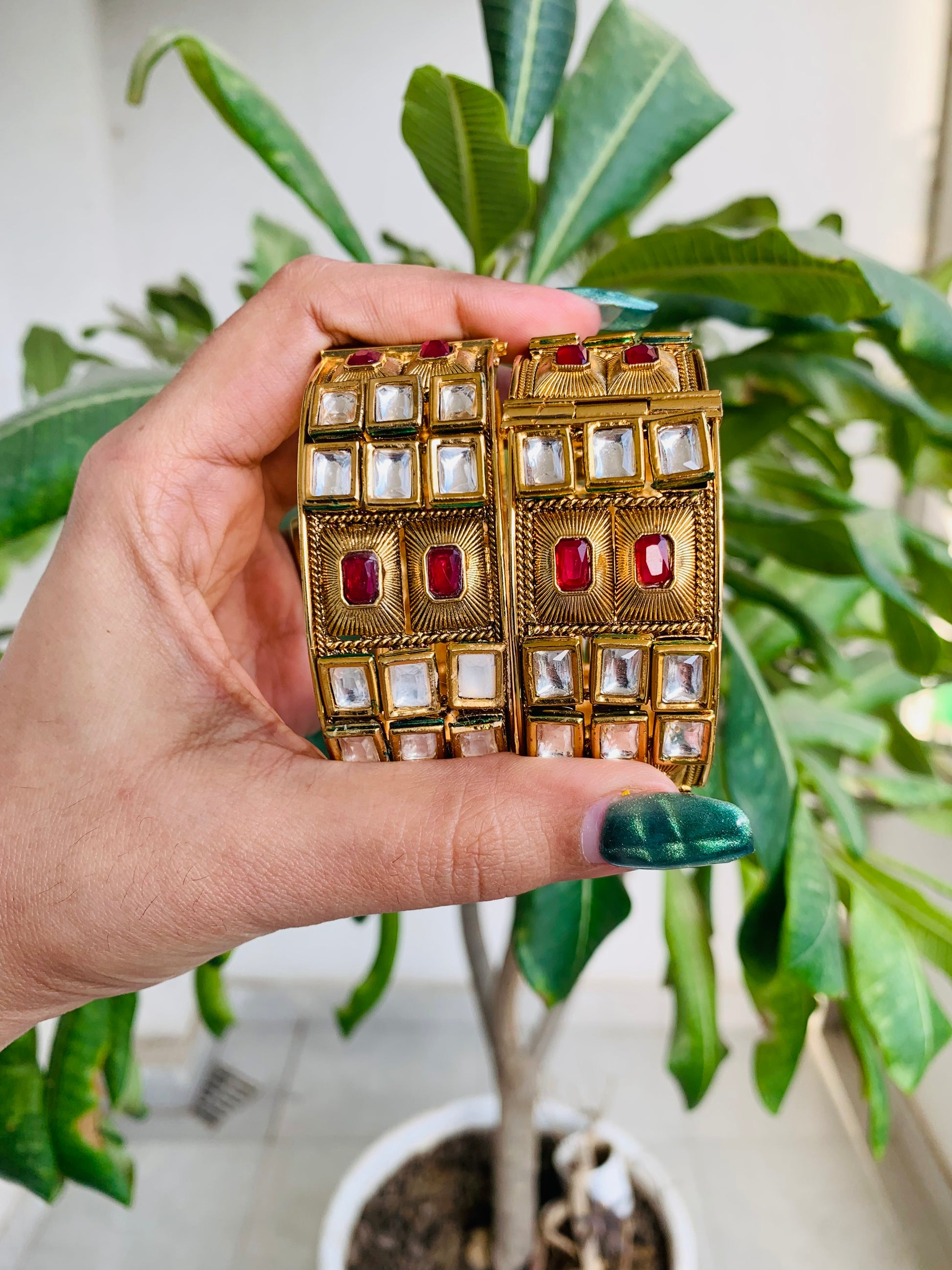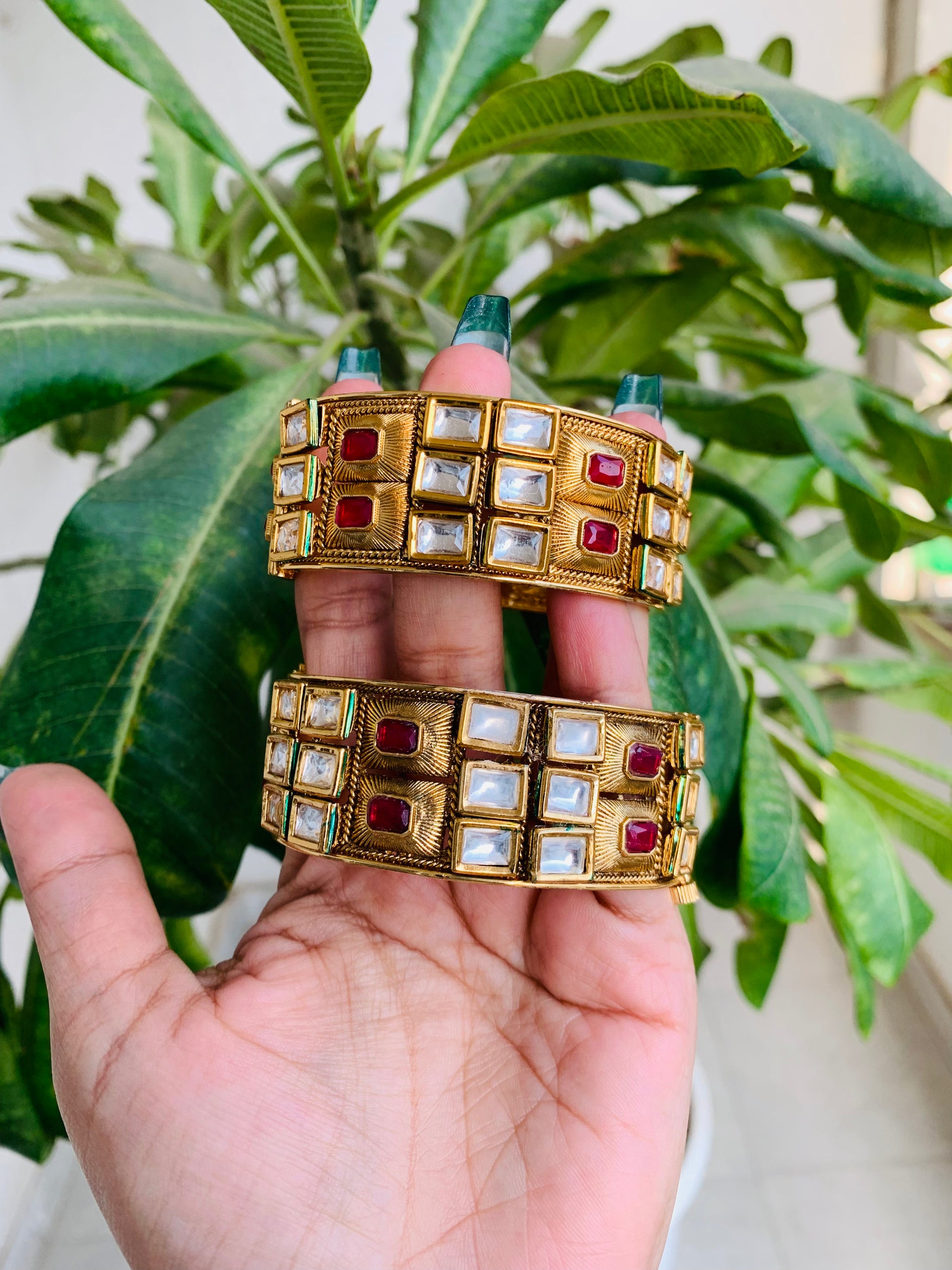 Elevate your style with our Kundan and Natural Stone Bangles. Crafted with precision, these rectangle-shaped bangles feature stunning Kundan and a matte gold finish. Experience the amazing quality and add a touch of glamour to any outfit. Perfect for any occasion, these bangles will make a statement wherever you go.