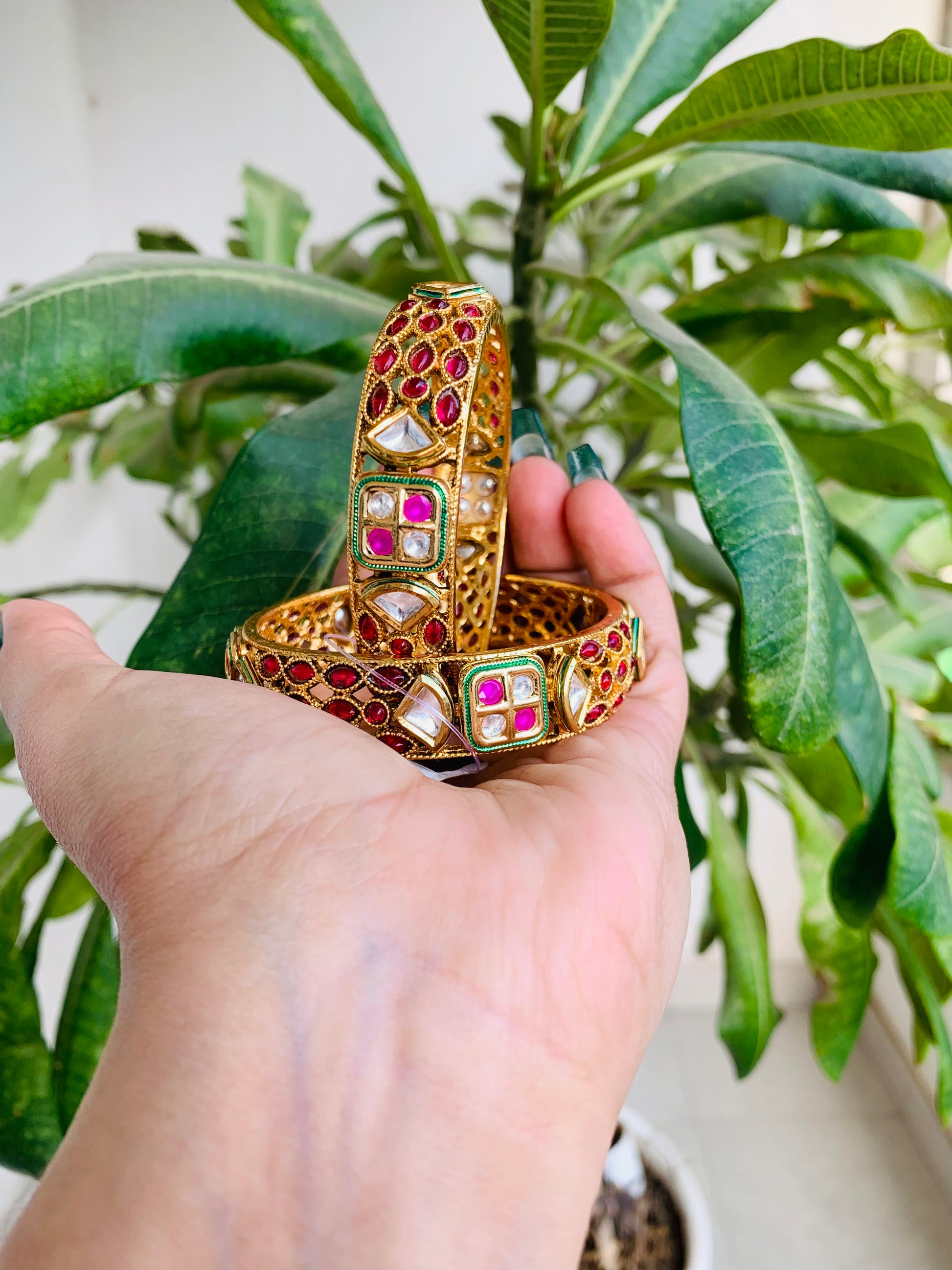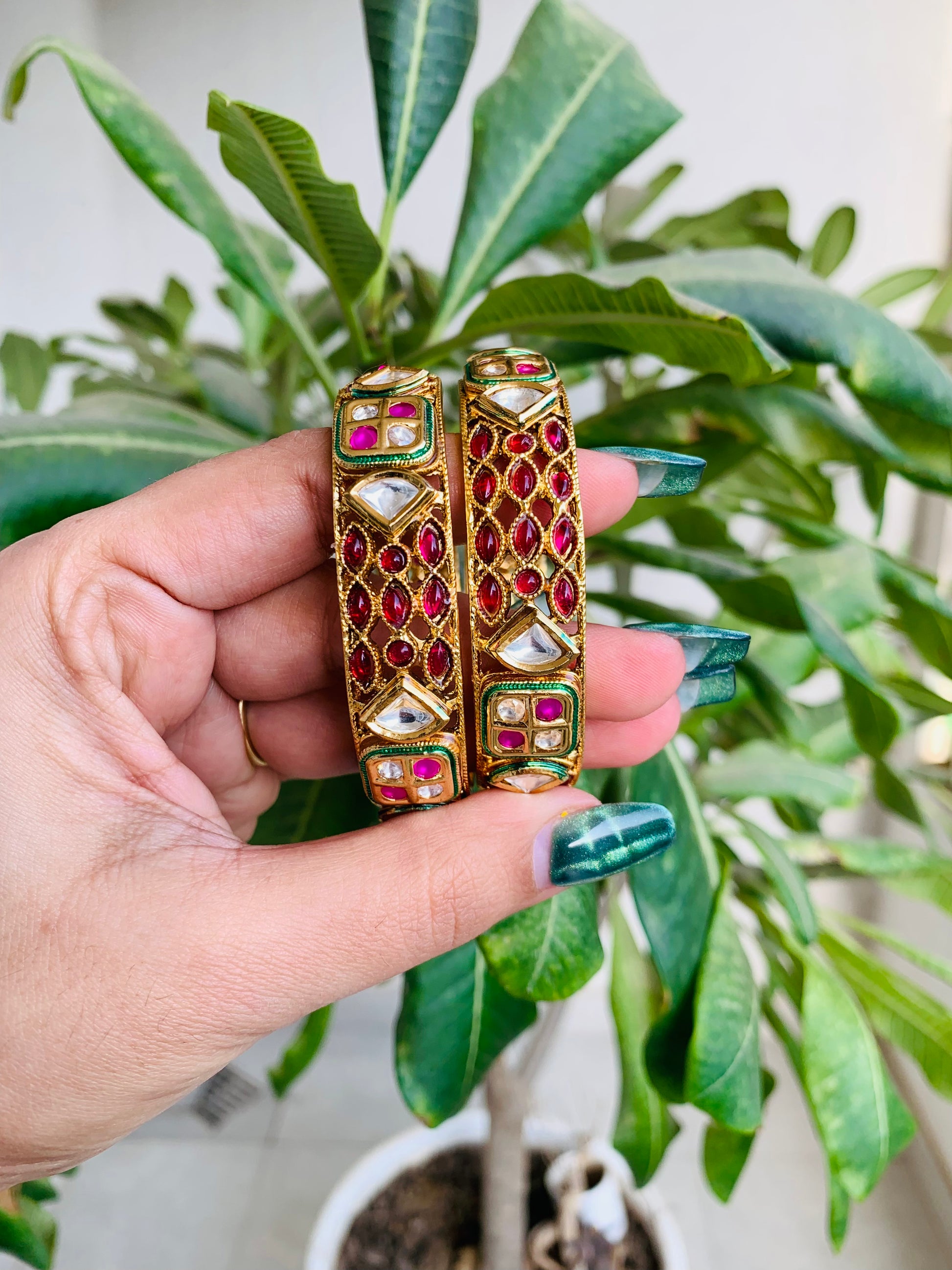 Experience the intricate beauty of our Kundan Ruby Stones Bangles. Crafted with premium quality materials, these Rajasthani style bangles are full of vibrant colors and accented with a touch of gold. Elevate your accessory game with these statement bangles today.