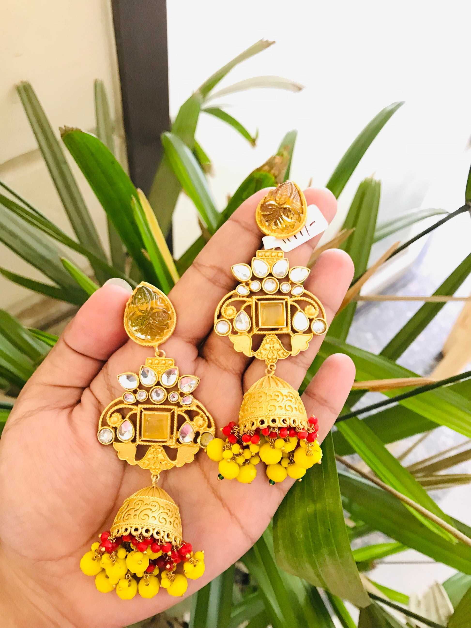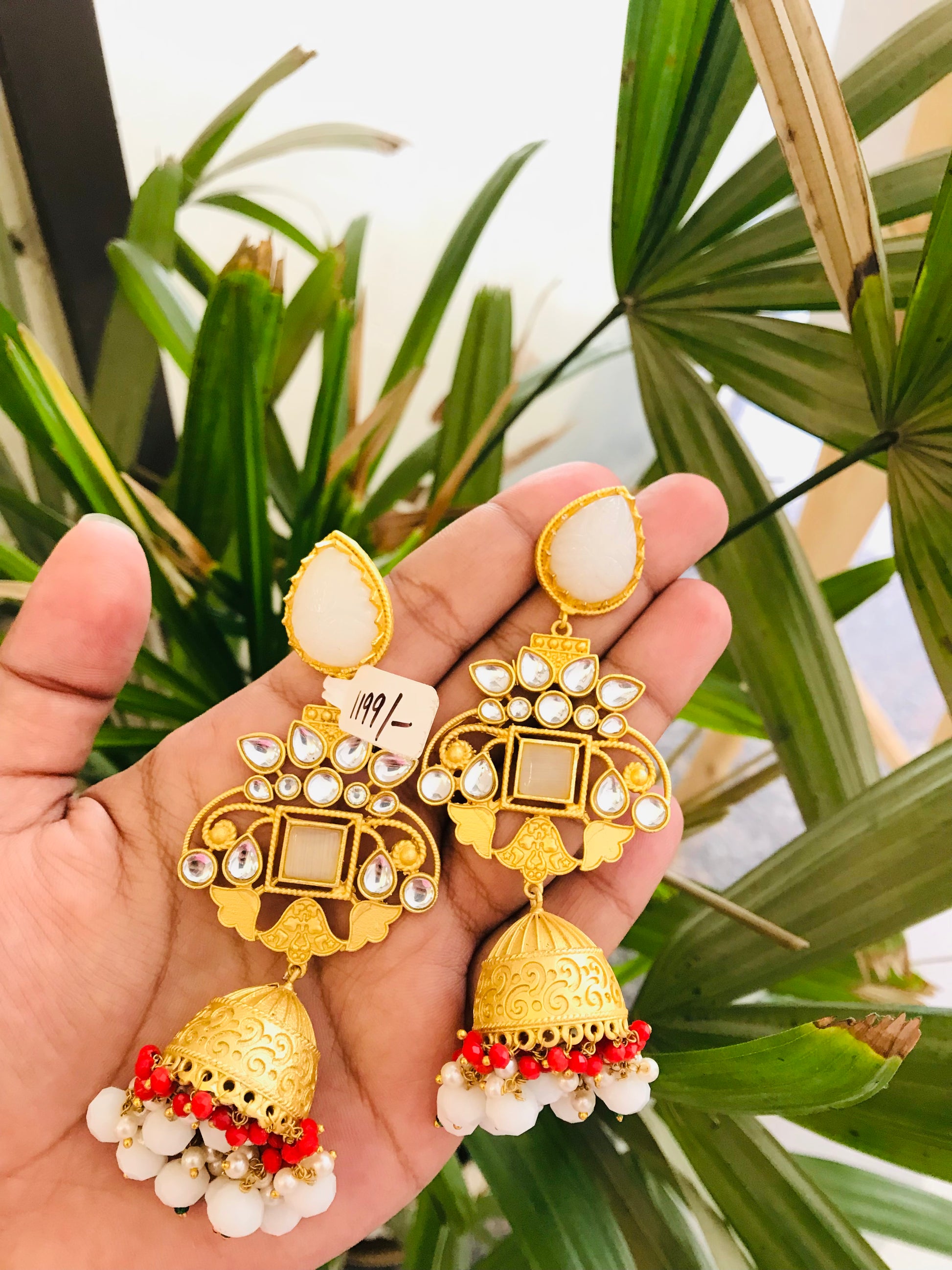 This is a perfect combination of natural carved stone and matte gold jhumkas. A must-have piece for the upcoming festive season.