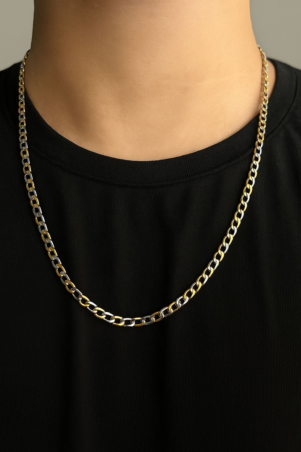 The Two-Tone Cuban Link Chain features a striking mix of gold and silver tones in a classic Cuban link design. With smooth, interlocked links, it brings effortless boldness to any outfit—whether you’re heading to a party or styling everyday wear.