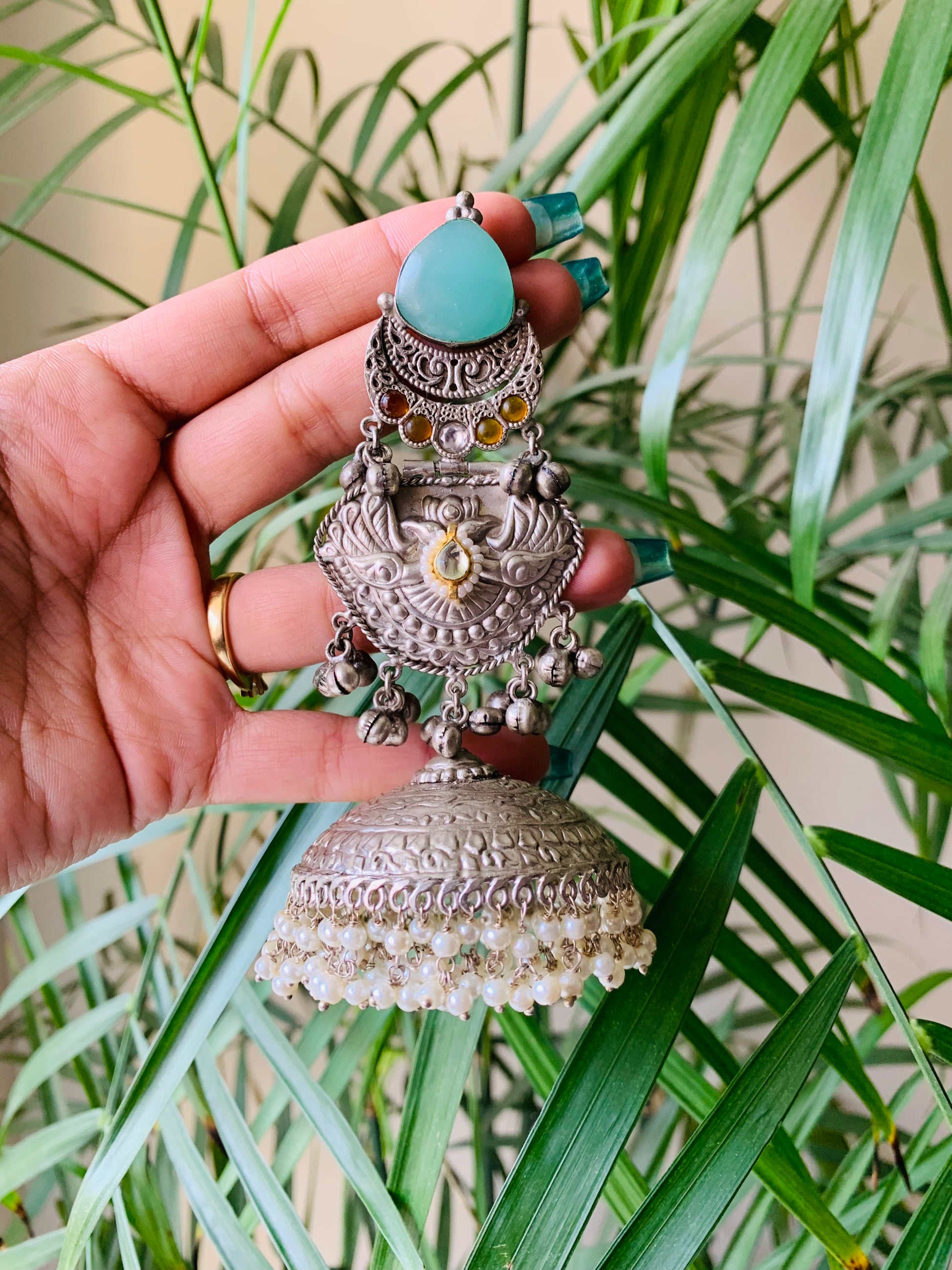 Introducing our Mint Green Stone Jumbo Jaipuri Jhumka, featuring natural stones and pearls for an antique and elegant look. With its big size, this jhumka pairs perfectly with any outfit and boasts best quality and a silver look alike design. A must-have for any jewelry lover.