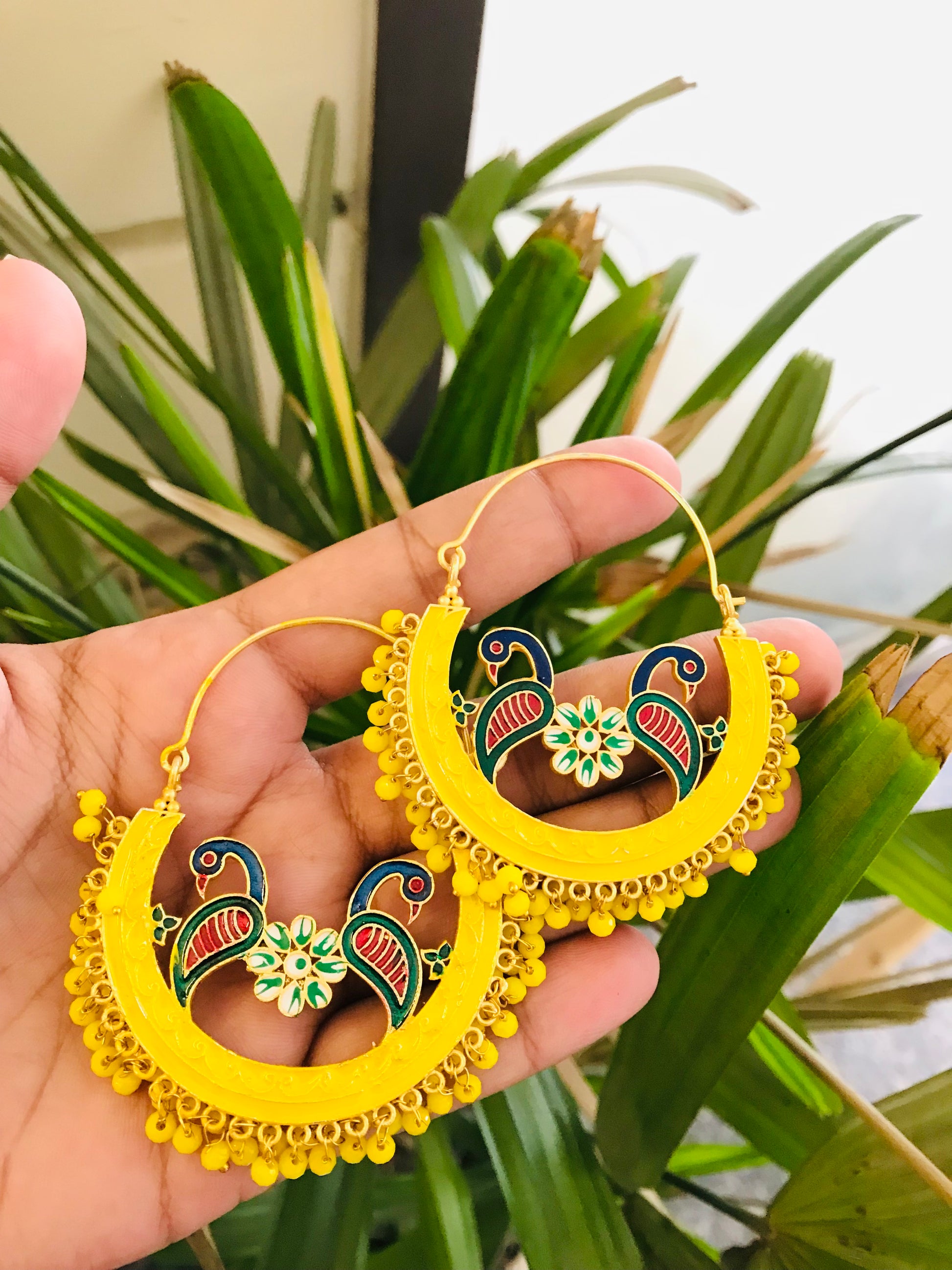 This is the most awaited earring at our store! A beautiful peacock design in bright colors and a baali style pattern. This is the perfect size to suit everyone and every outfit.