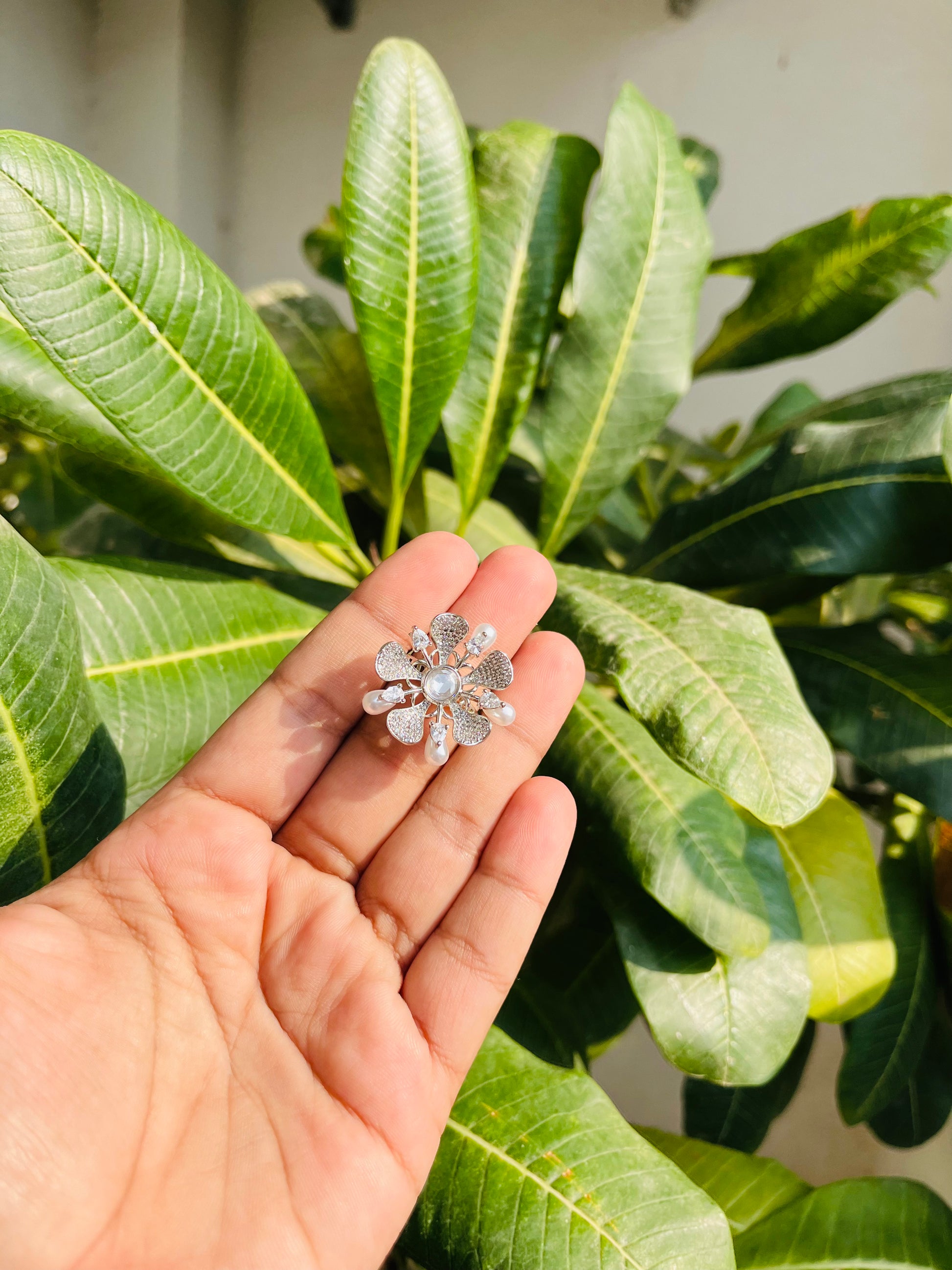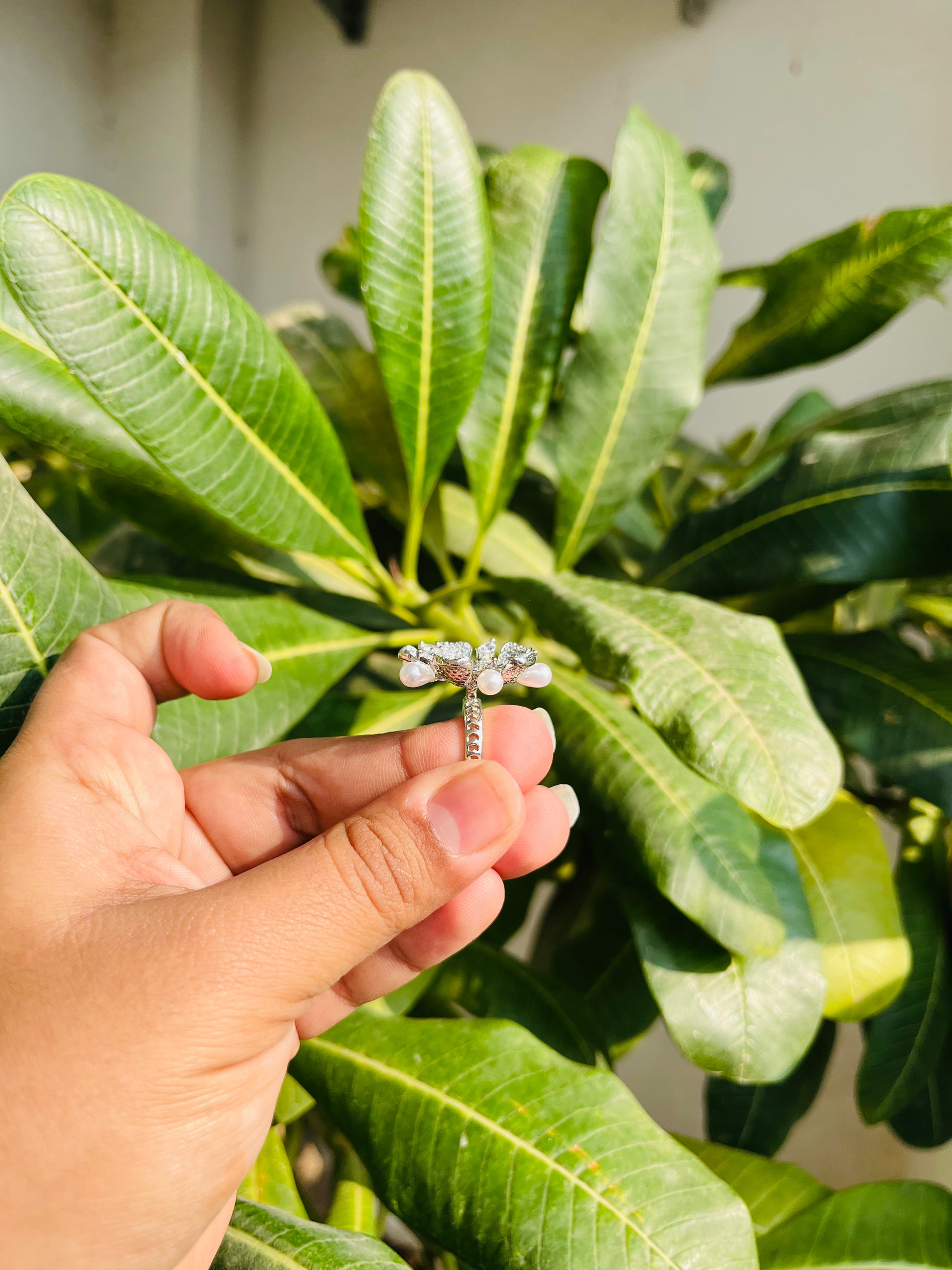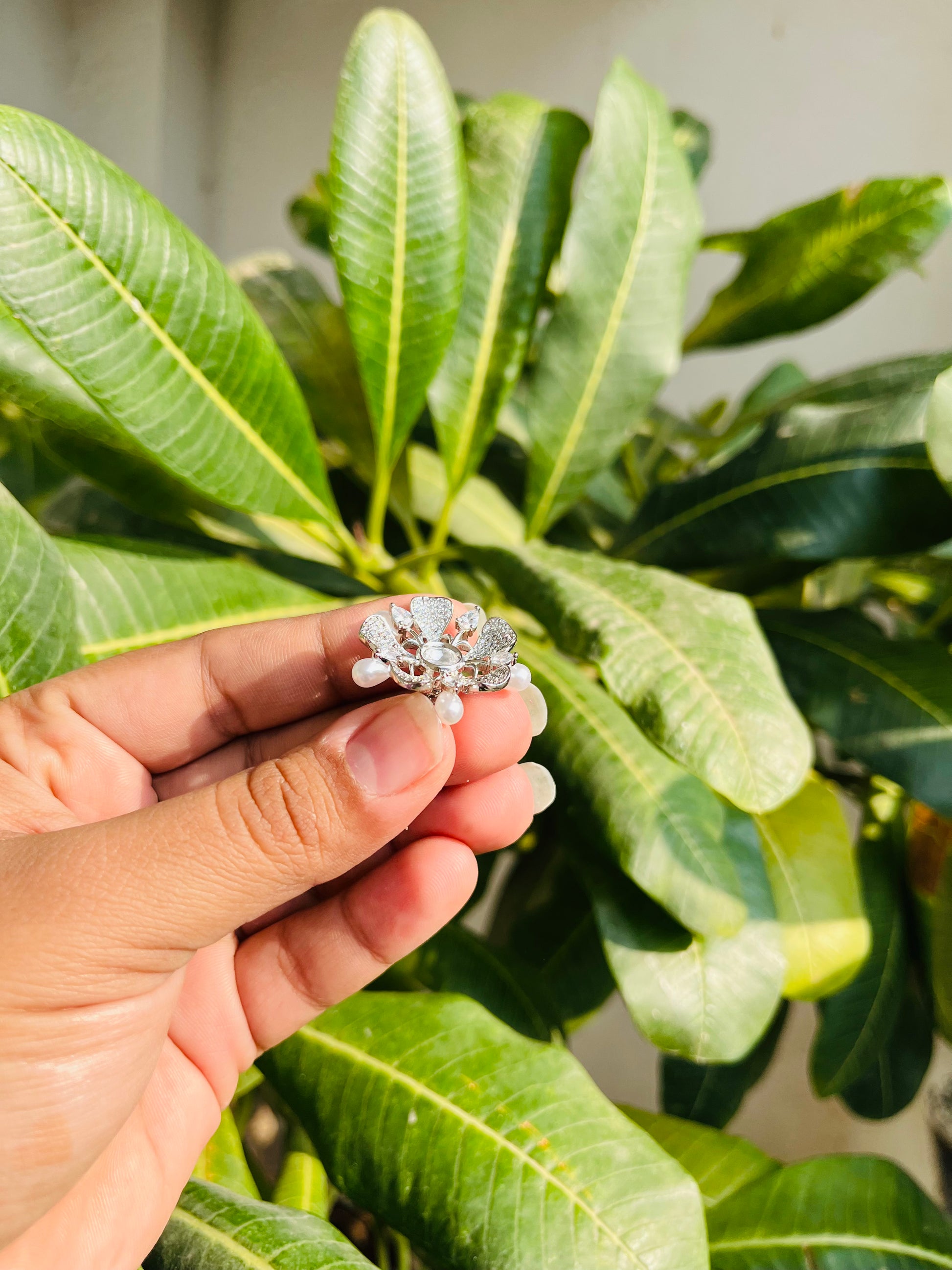 This elegant ring combines the timeless beauty of pearls with the modern sparkle of Micro AD. The unique design and medium size make it a perfect addition to any outfit. Elevate your style with this sophisticated and tasteful accessory.