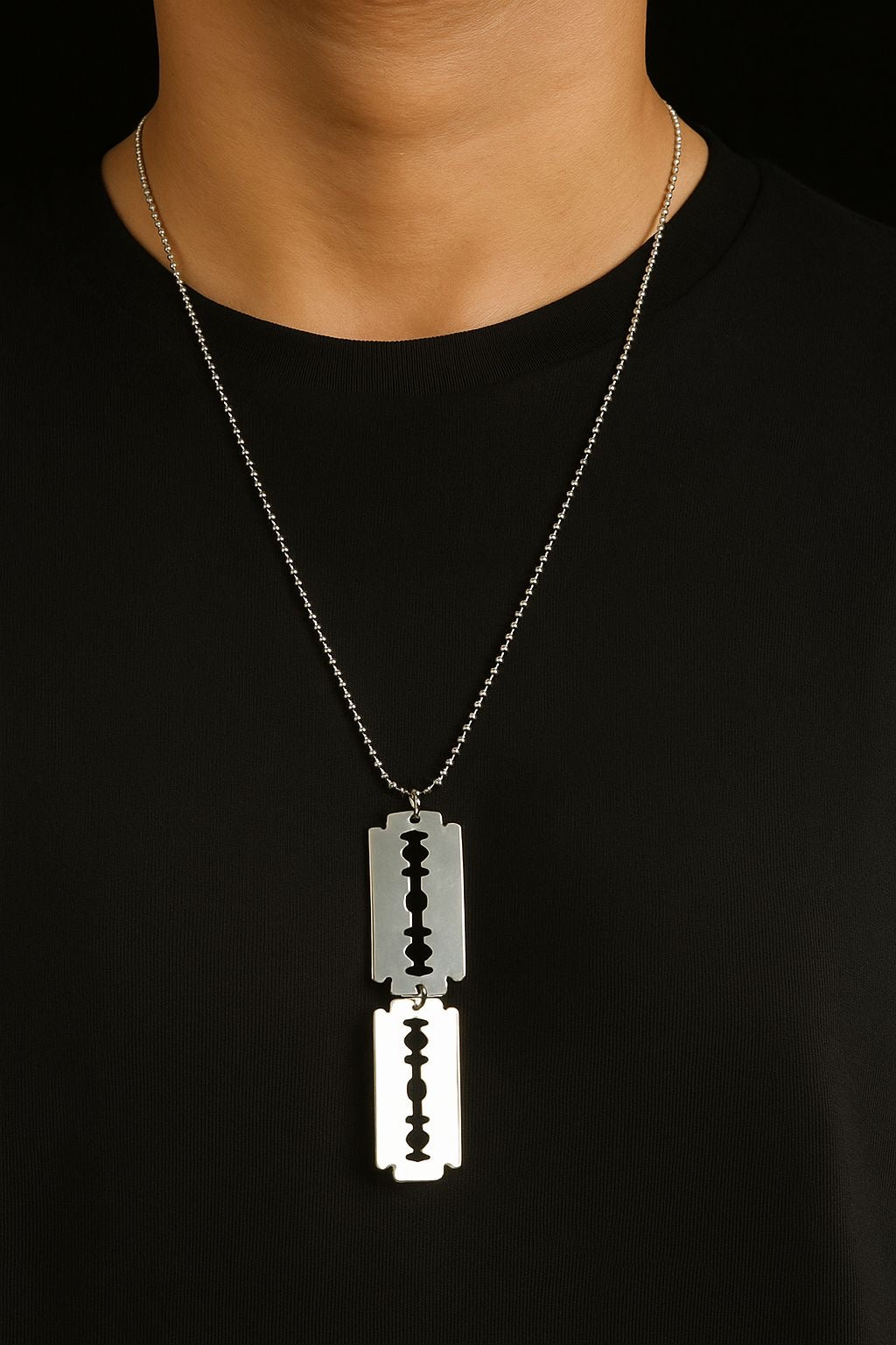 Make a bold statement with this edgy silver-toned double razor blade pendant necklace. Crafted in high-quality stainless steel, it’s perfect for those who love rebellious, street-style accessories.
