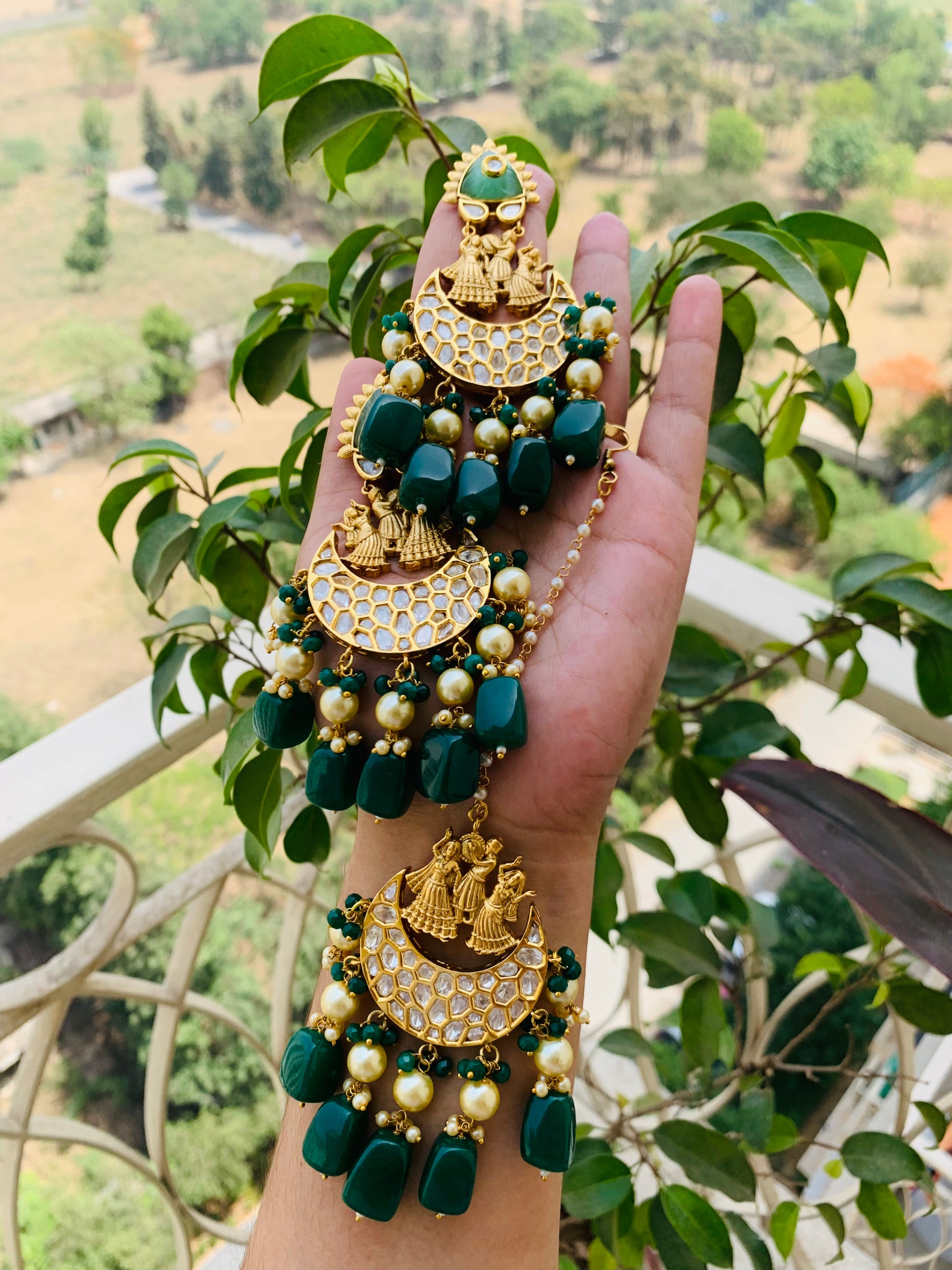 This is a very premium quality (silver foiled Kundan) on matte gold design, earrings with matching maangteeka. As much as you will love the quality, you will also love the beautiful design.