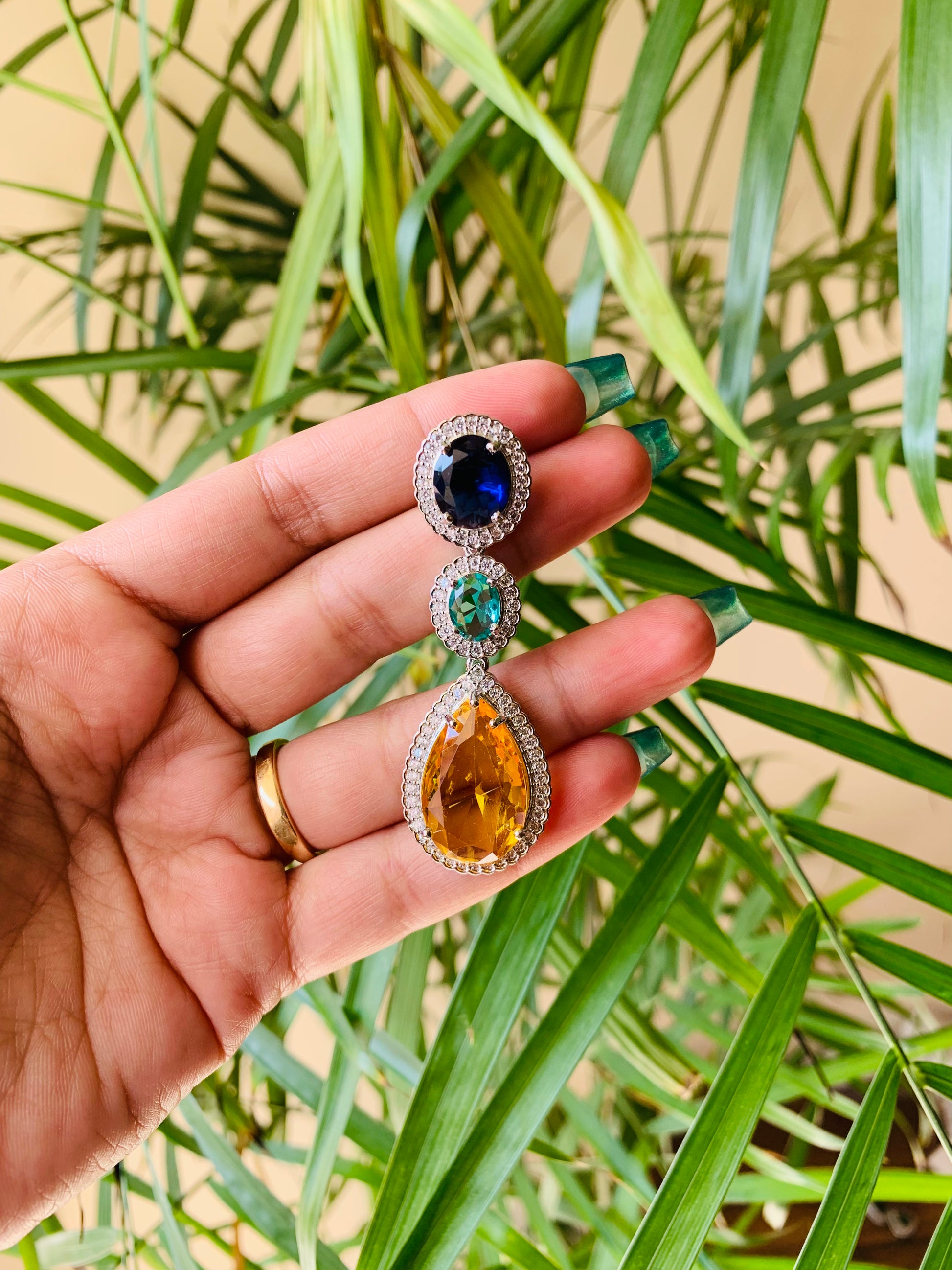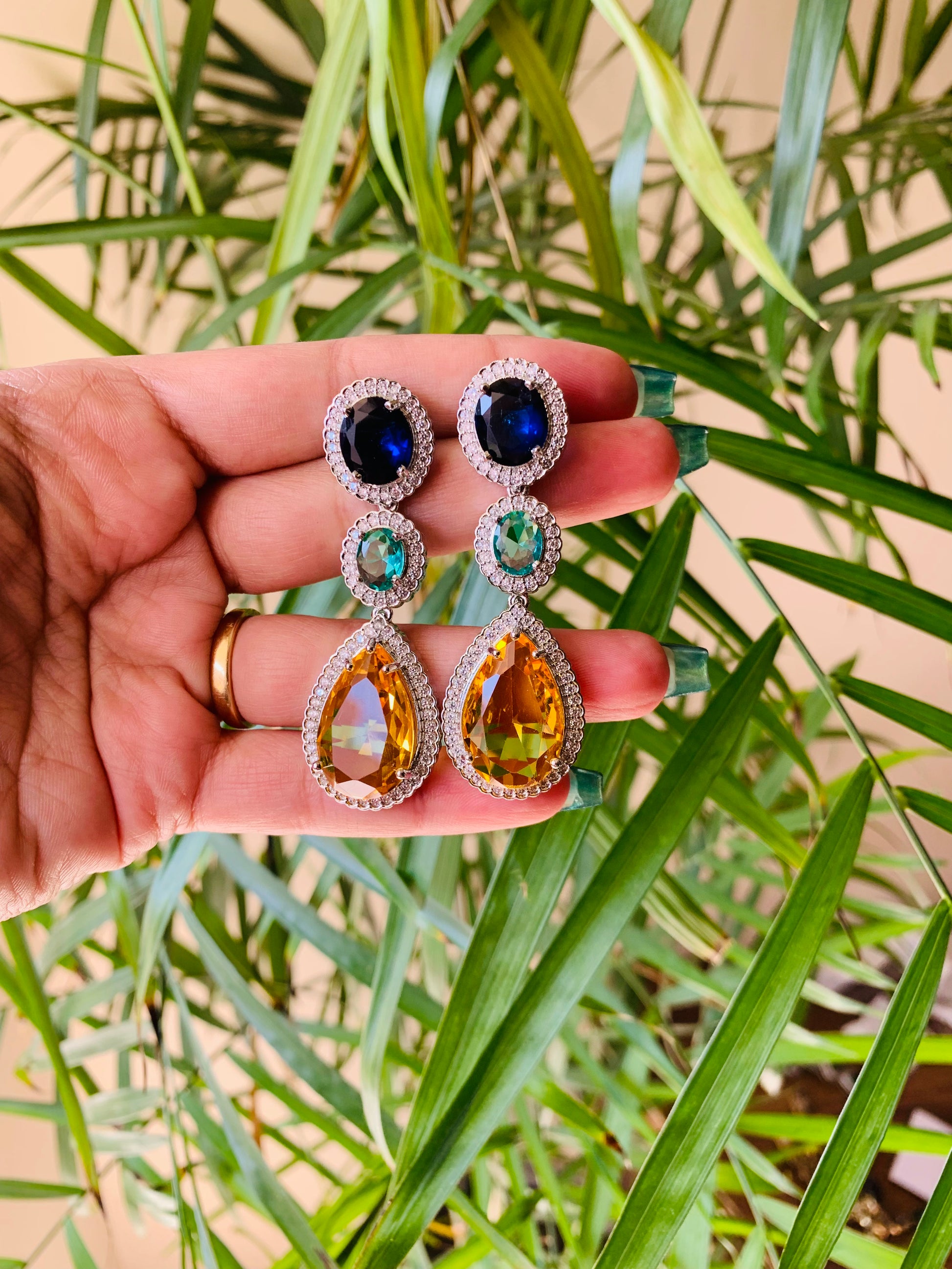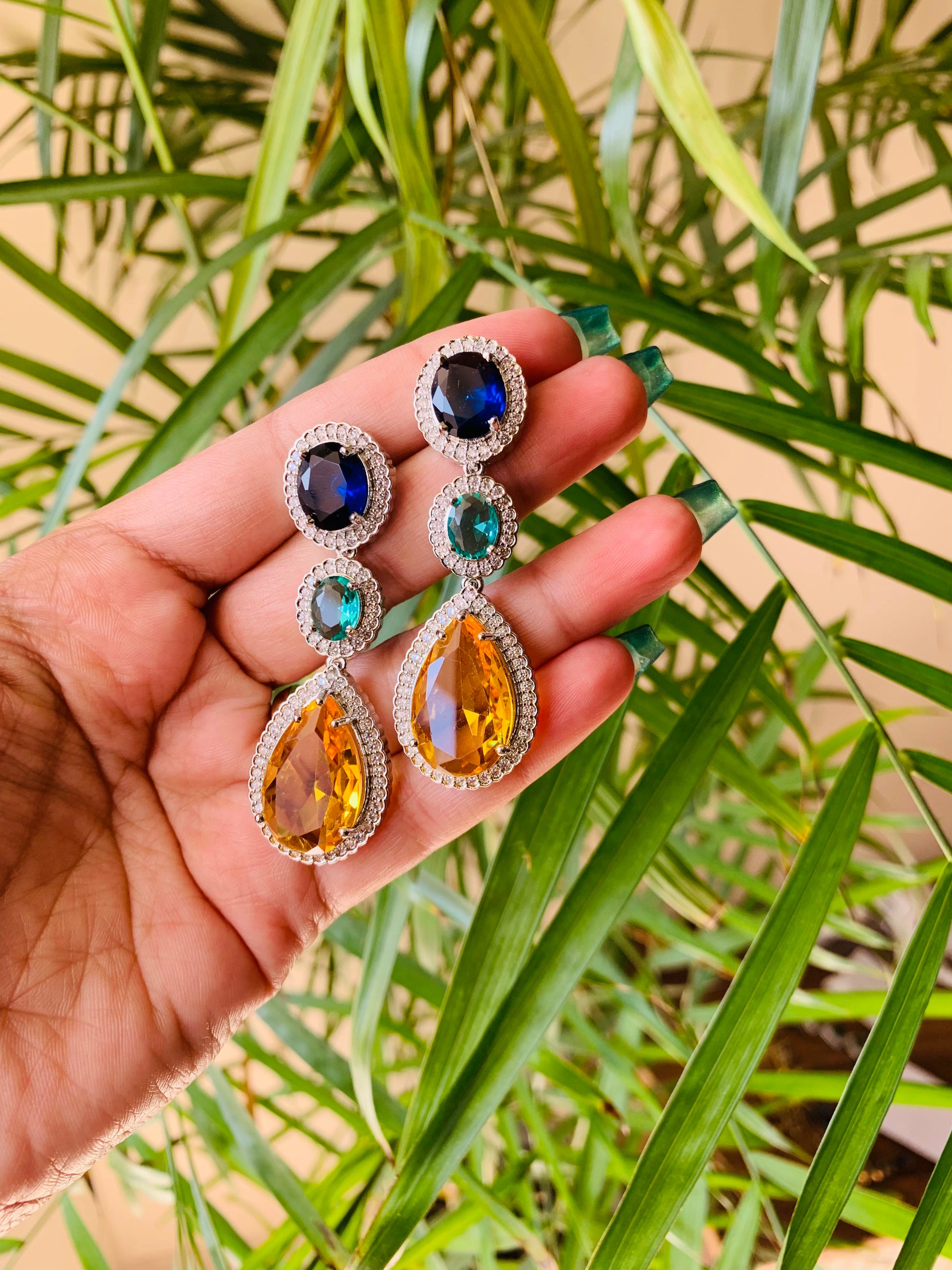 Expertly handcrafted with three layers of stunning Swarovski stones, these danglers are a must-have for any fashion-forward individual. The layered design provides a unique and eye-catching look, making them the perfect accessory to elevate any outfit. Add a touch of elegance and sophistication to your wardrobe with these exquisite earrings.