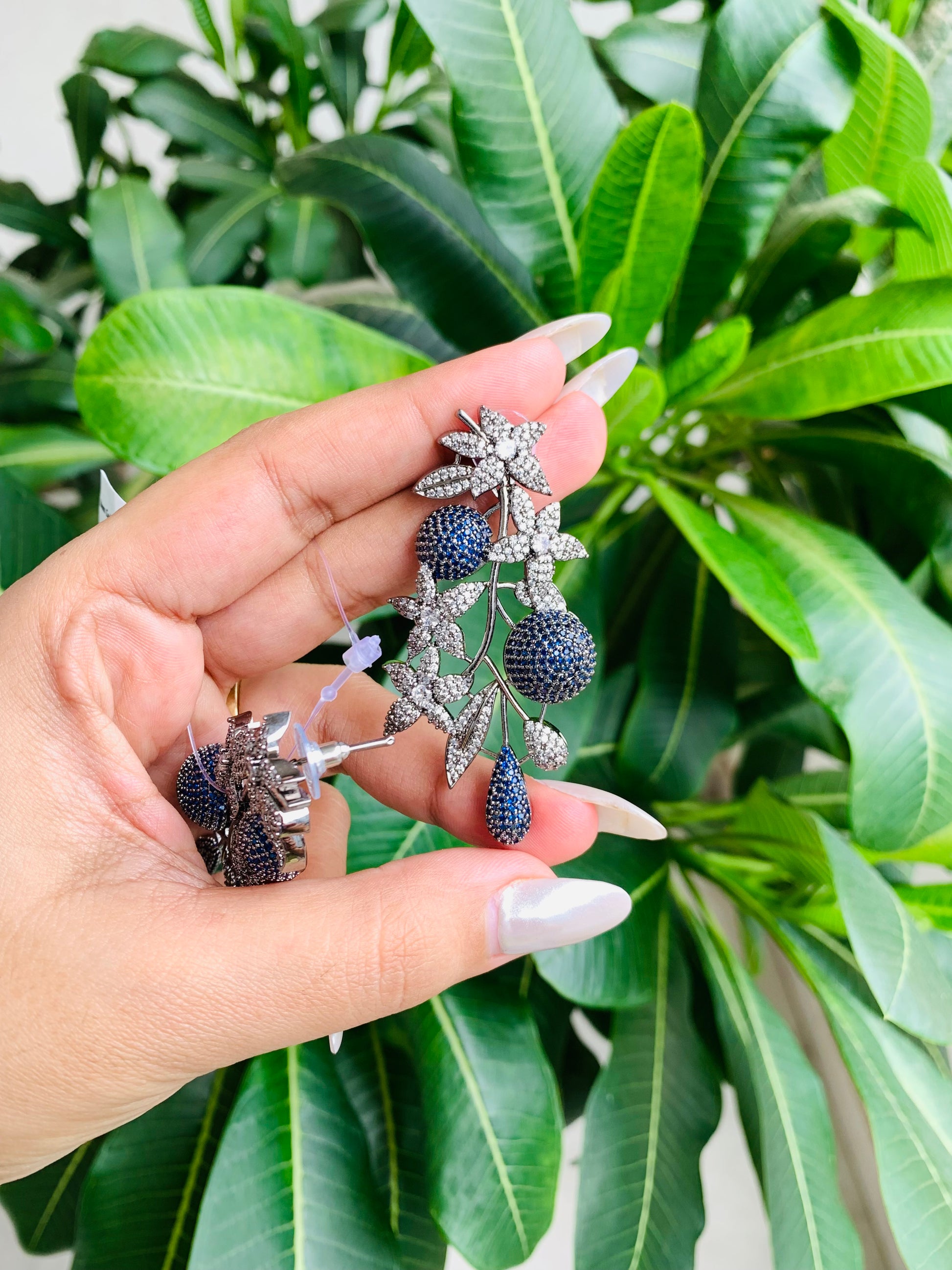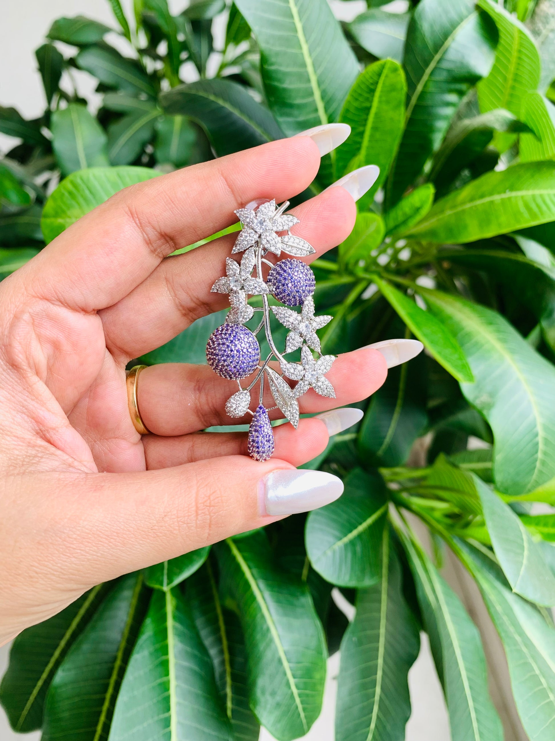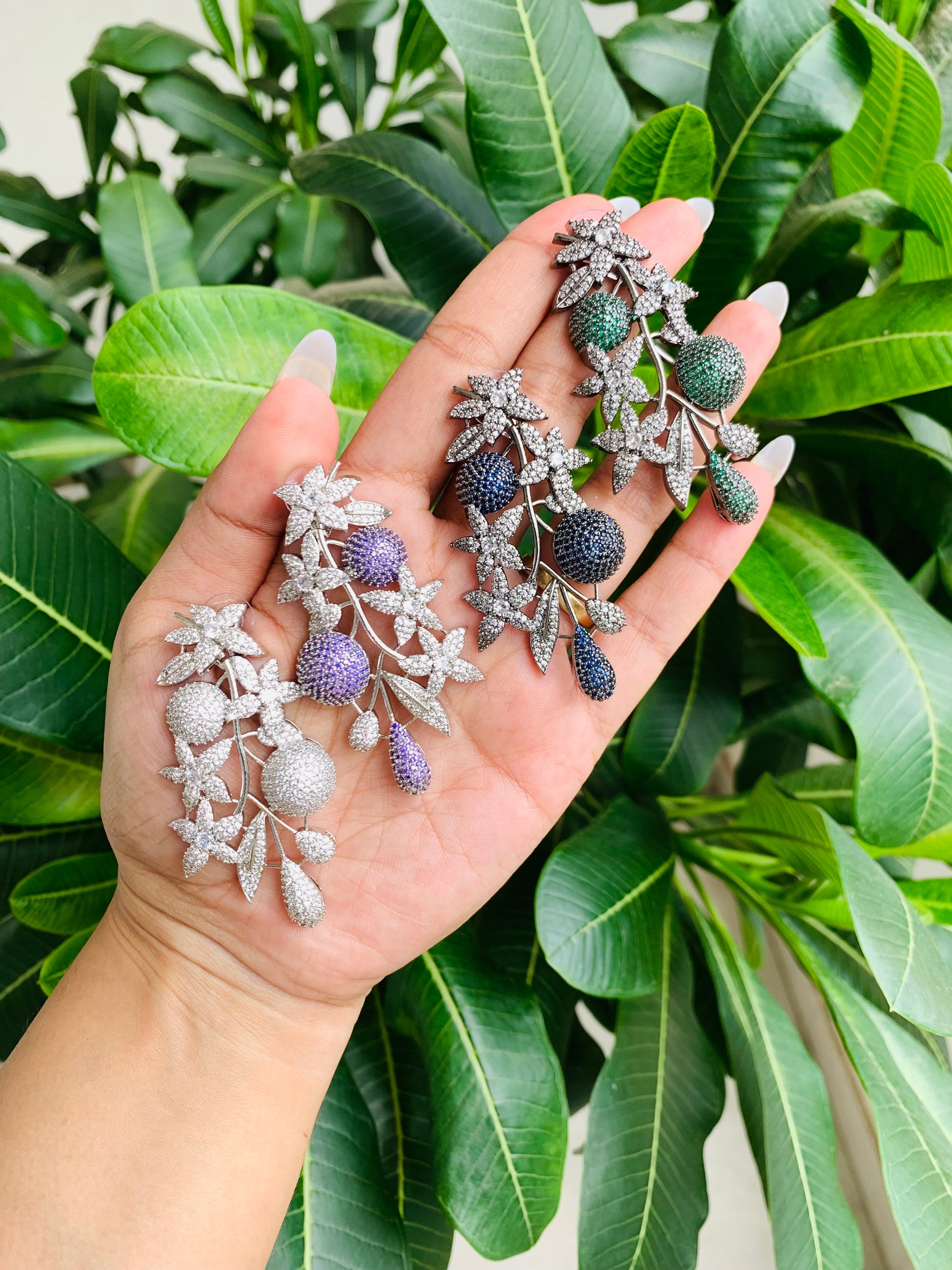 Introducing the American Diamond Long Statement Earrings, the perfect accessory for a bold and unique style. These statement-long studs feature an intricate design of flowers and berries in a variety of colors. With an amazing look that will make you stand out, these earrings are a must-have for any fashion-forward individual. Elevate your outfit with these stunning long earrings.