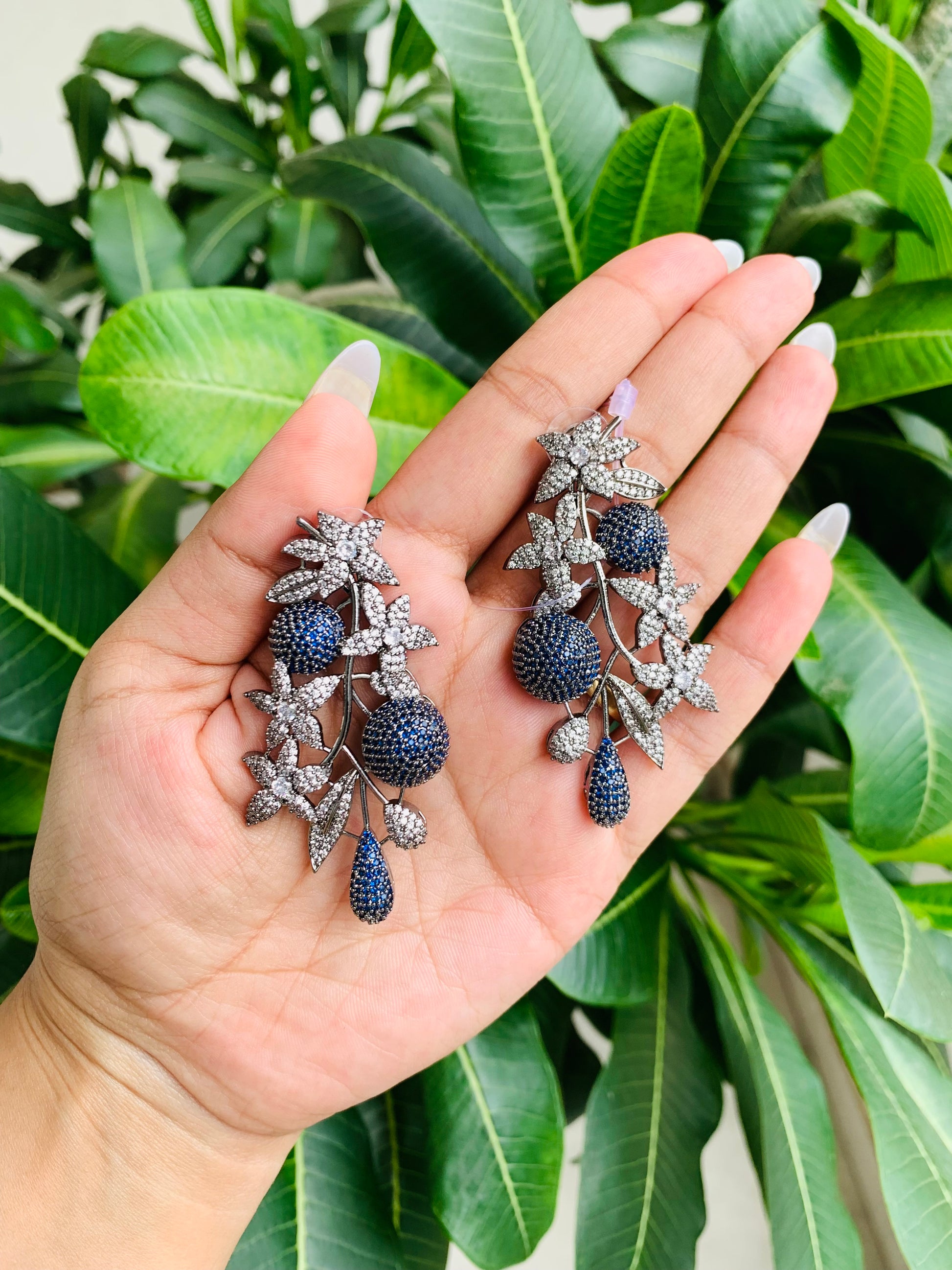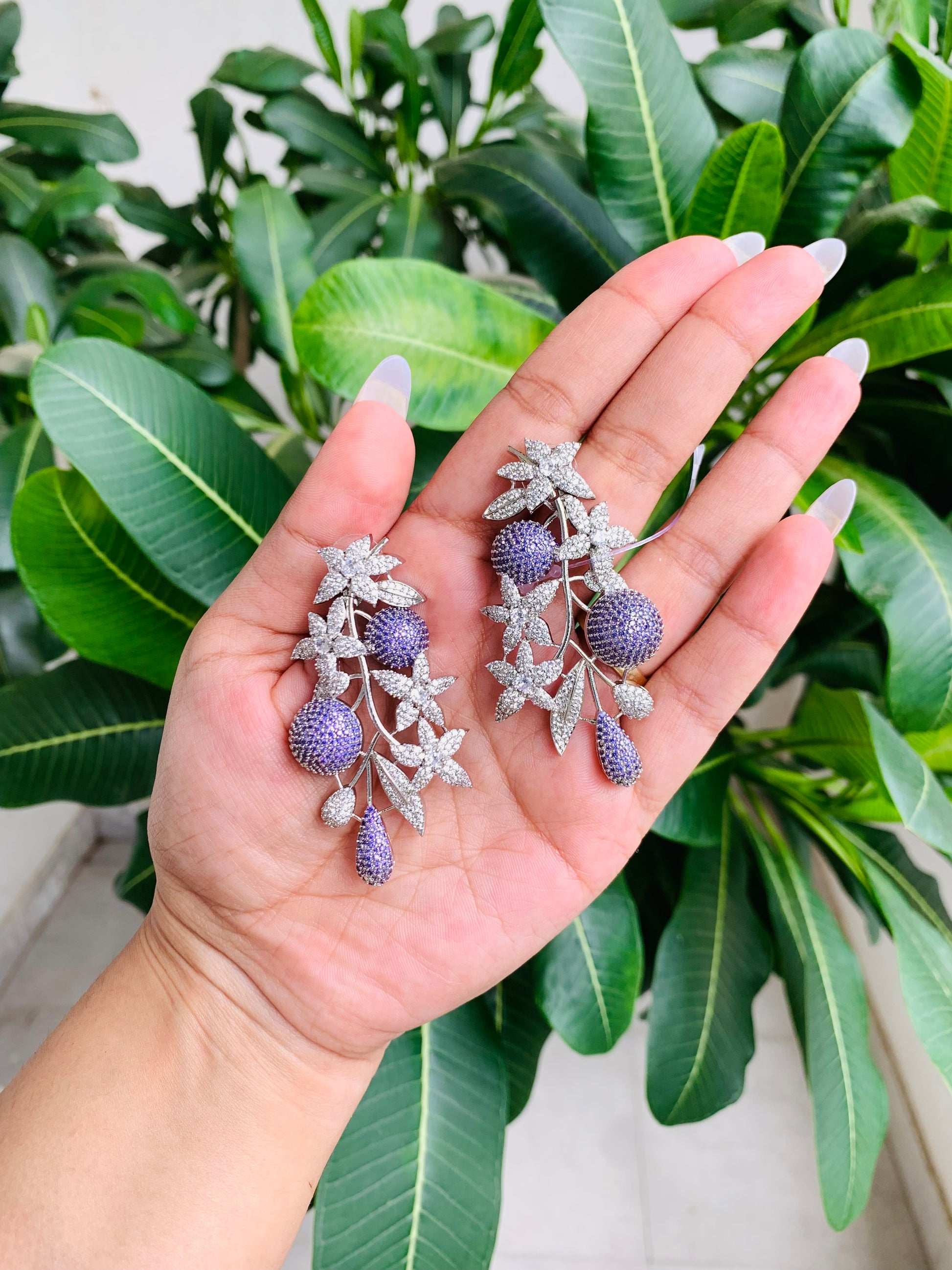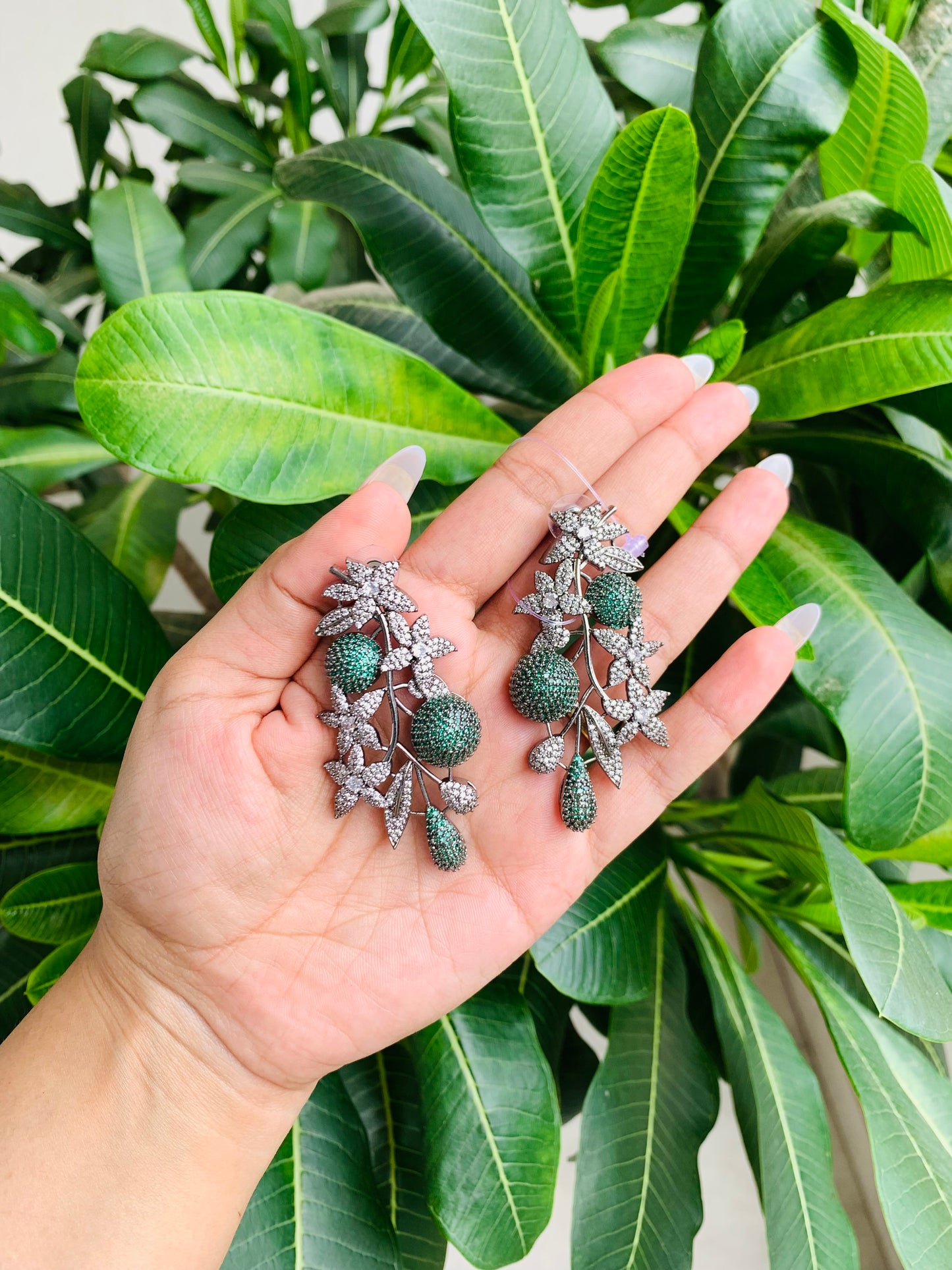 Introducing the American Diamond Long Statement Earrings, the perfect accessory for a bold and unique style. These statement-long studs feature an intricate design of flowers and berries in a variety of colors. With an amazing look that will make you stand out, these earrings are a must-have for any fashion-forward individual. Elevate your outfit with these stunning long earrings.